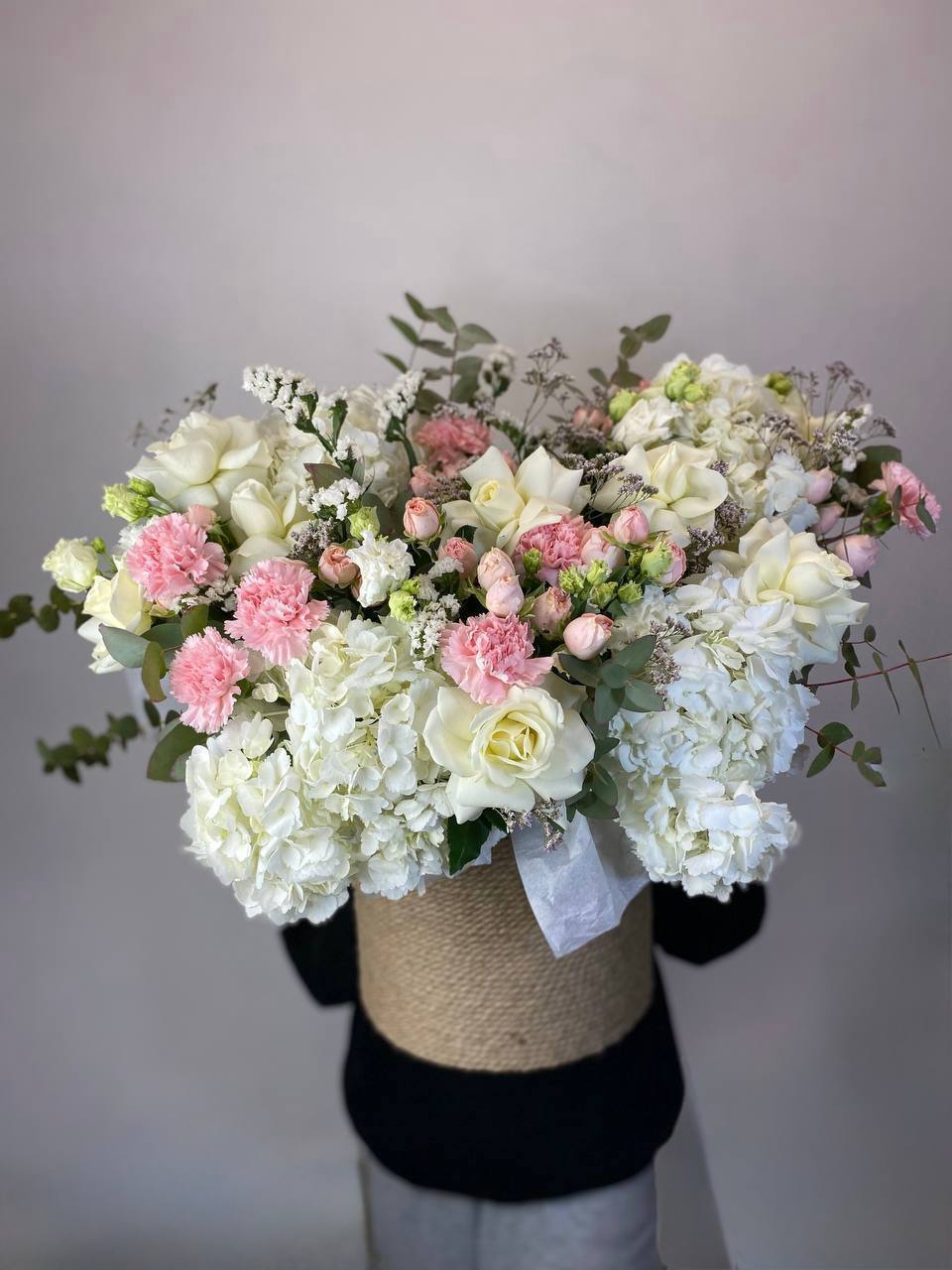 Сто один белый бутон образует впечатляющую композицию с выразительным силуэтом. Монохромное решение подчёркивает архитектуру букета и его визуальное присутствие в пространстве.