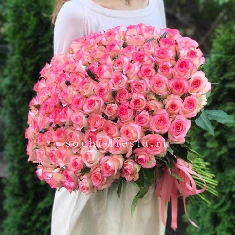 Сто один бутон собран в плотную круглую форму и обрамлён светлой упаковкой. Розовый оттенок лепестков создаёт мягкое цветовое пятно, которое заполняет пространство спокойной весенней энергией.