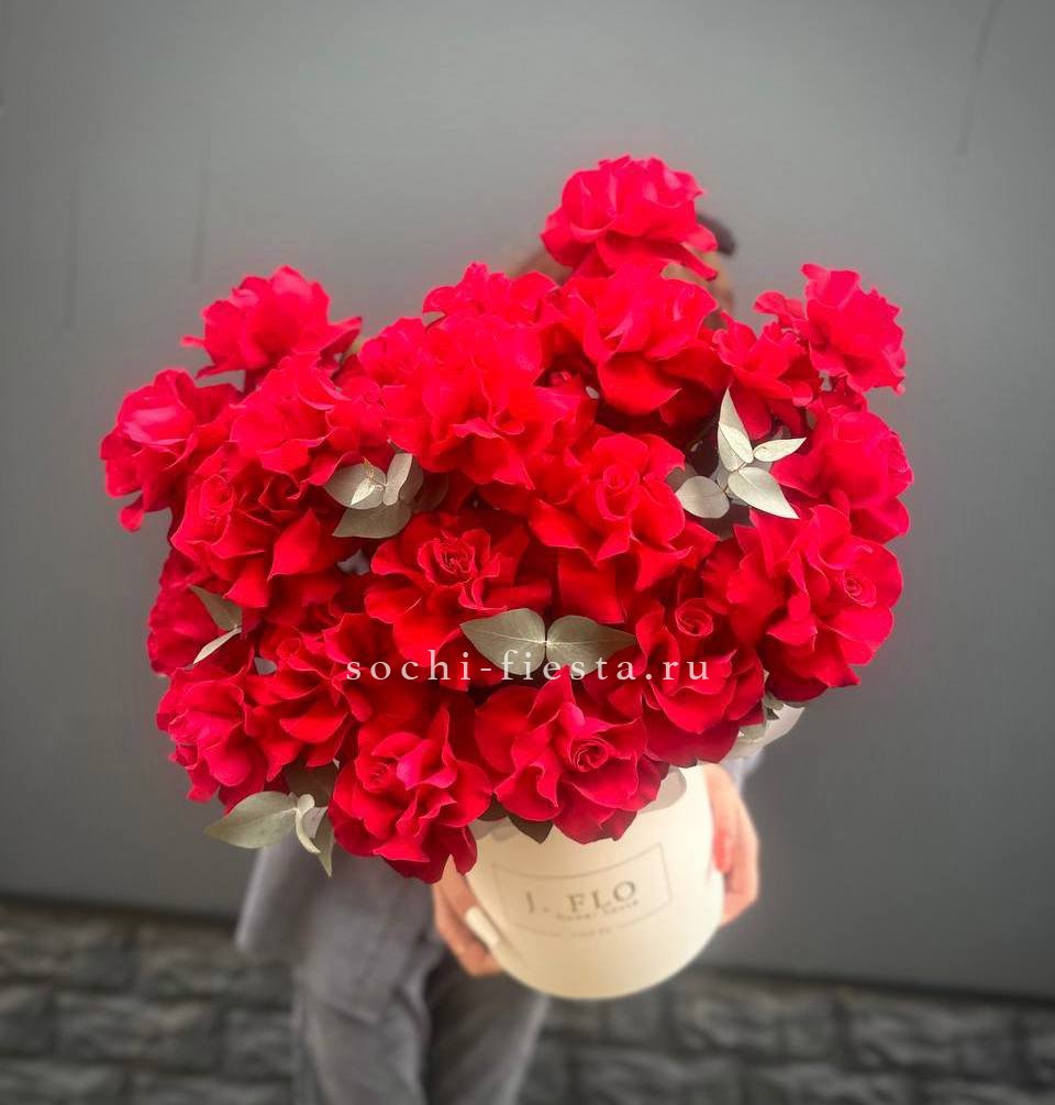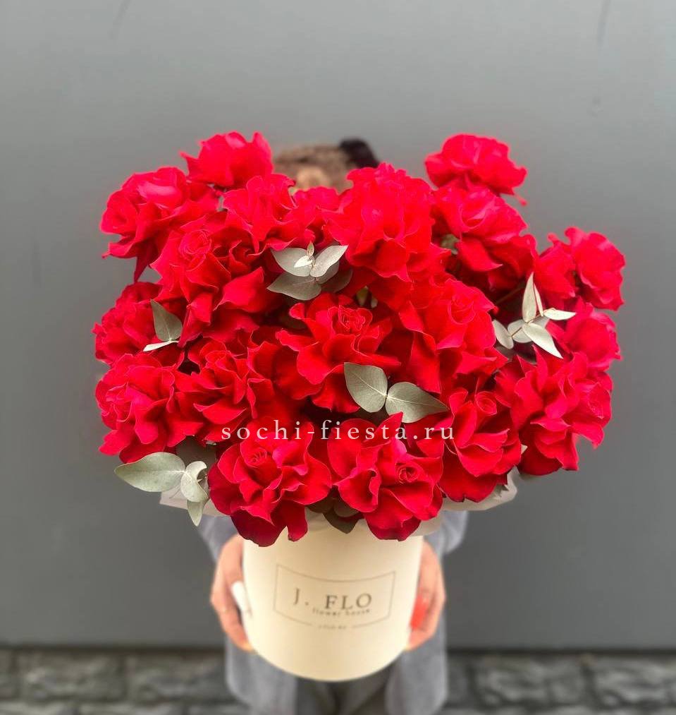 нежный бокс из французских роз сорта Венди, цилиндр D13, эвкалипт, лента, упаковка.