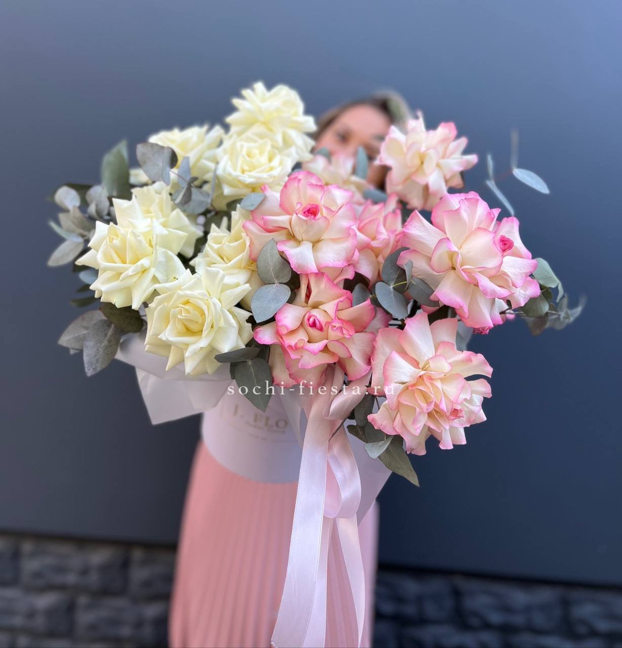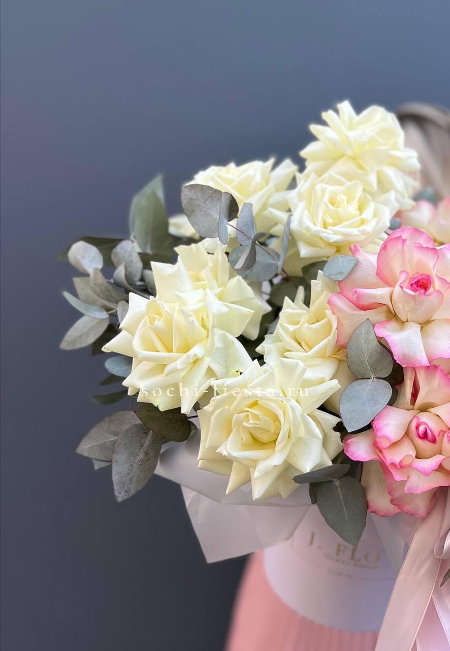 вывернутые белые розы и джумилия, цилиндр D16, эвкалипт, лента, упаковка.
