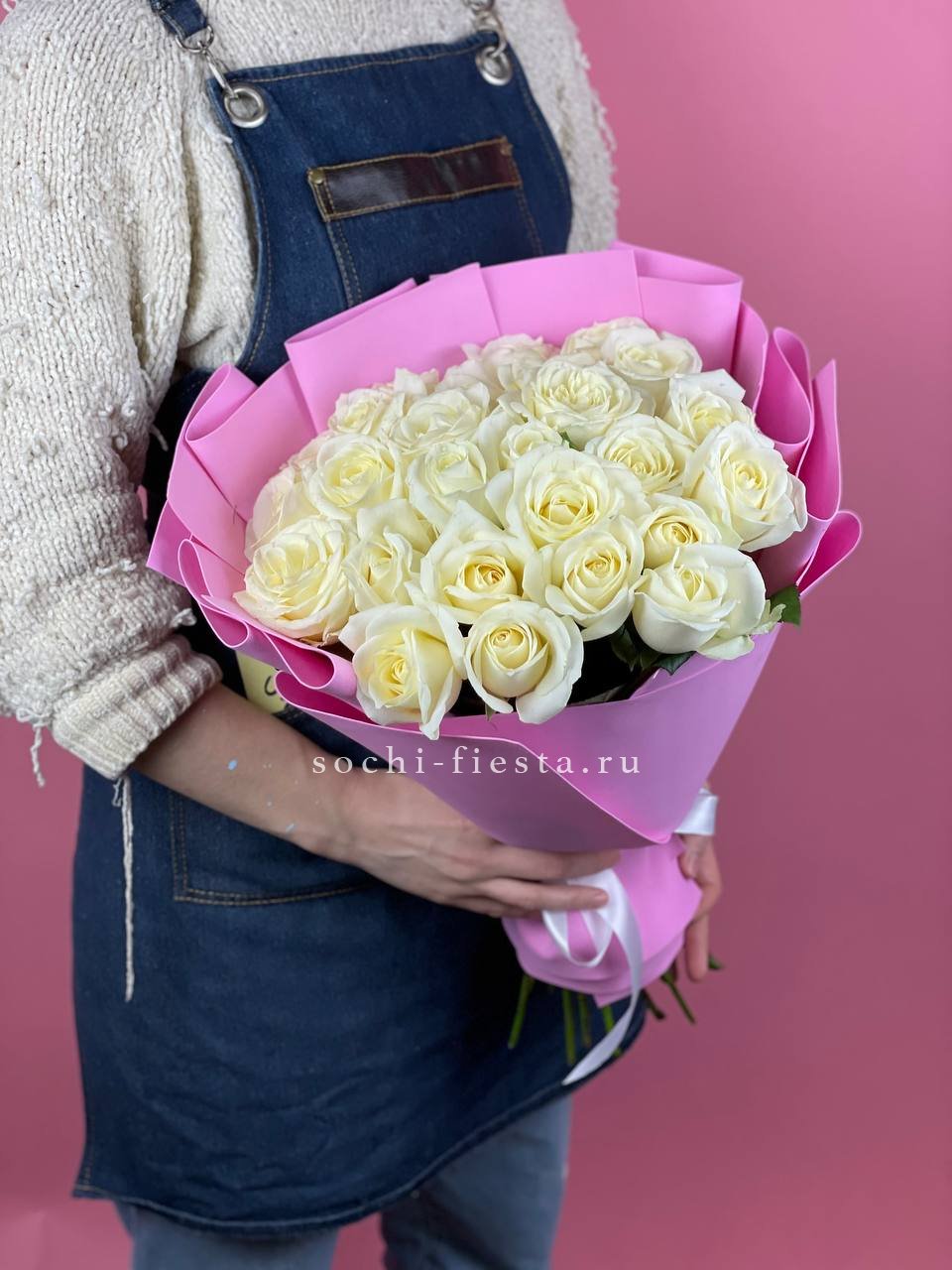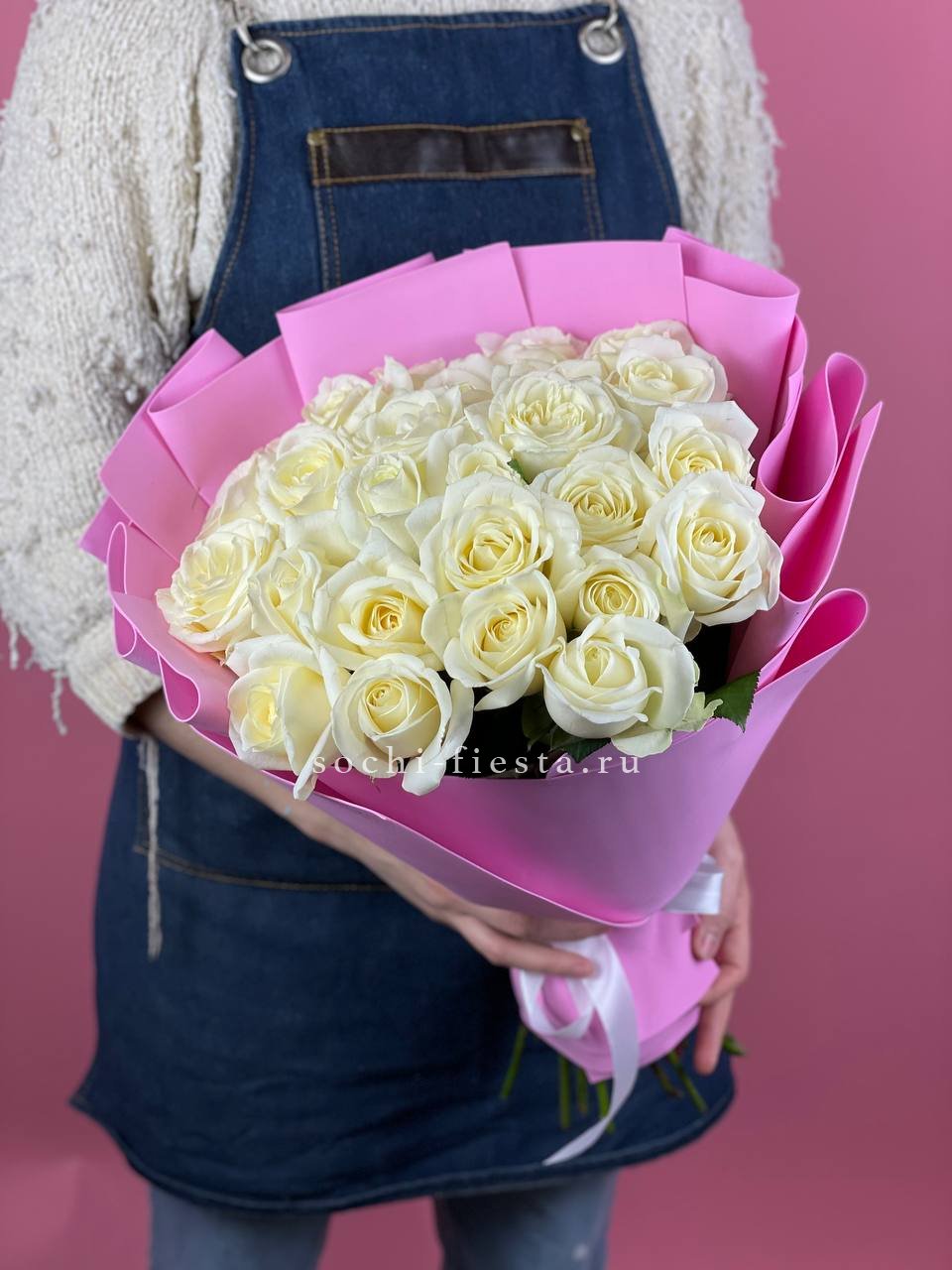 Тридцать пять белых роз образуют объемную композицию с выразительным силуэтом. Светлая упаковка поддерживает воздушность и графичность линий.