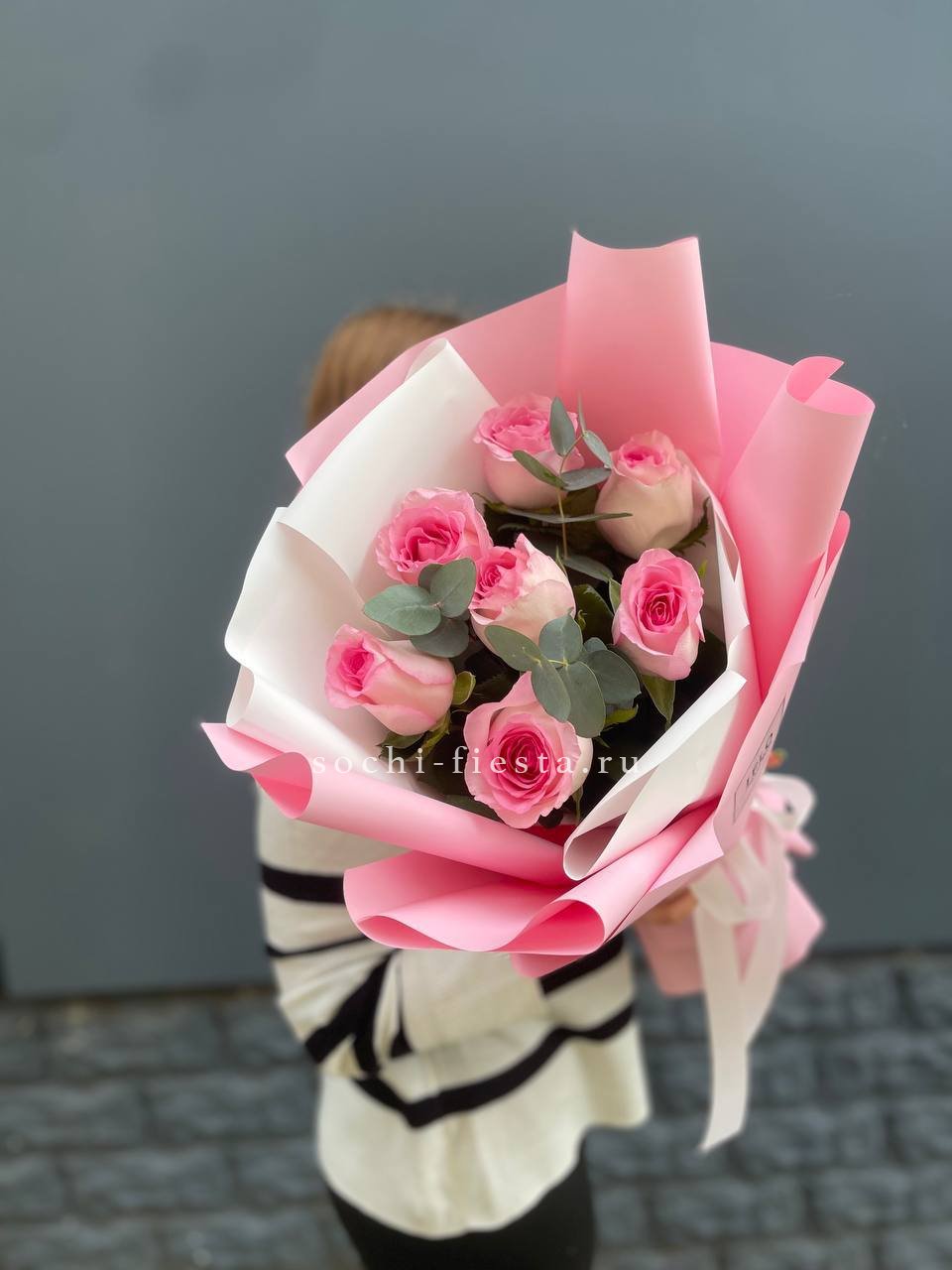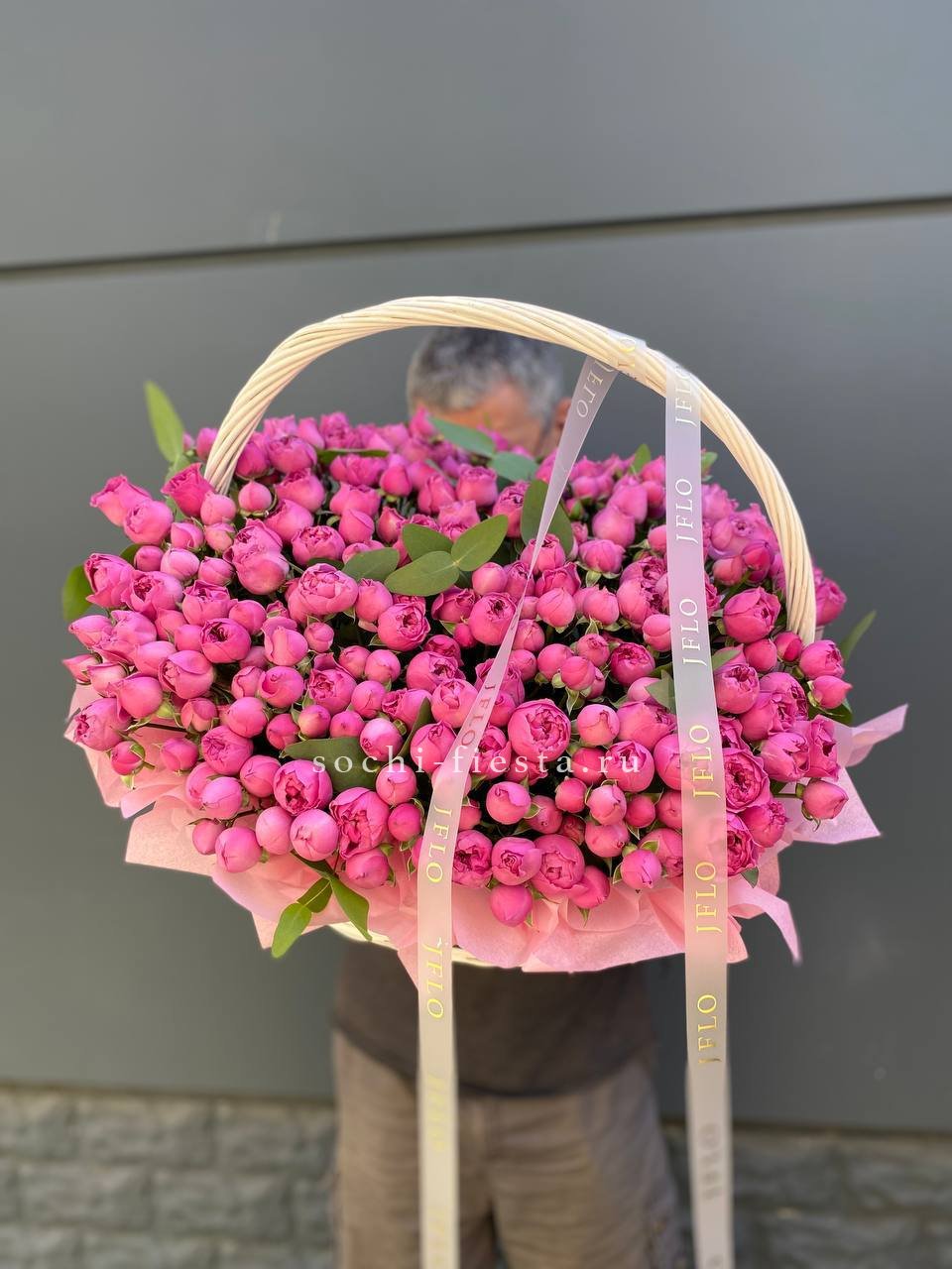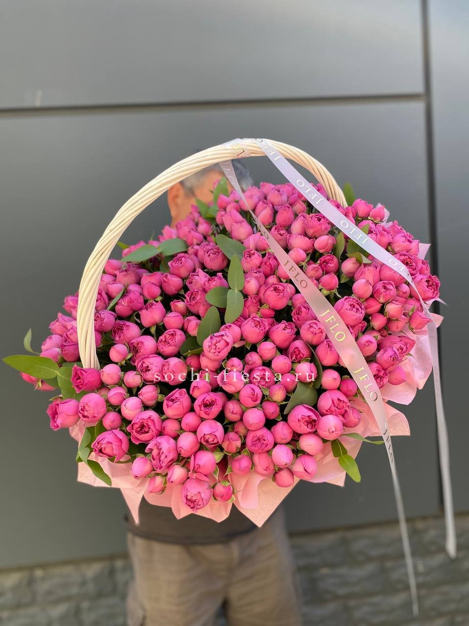 розовые розы, эвкалипт, пленка, корзина.