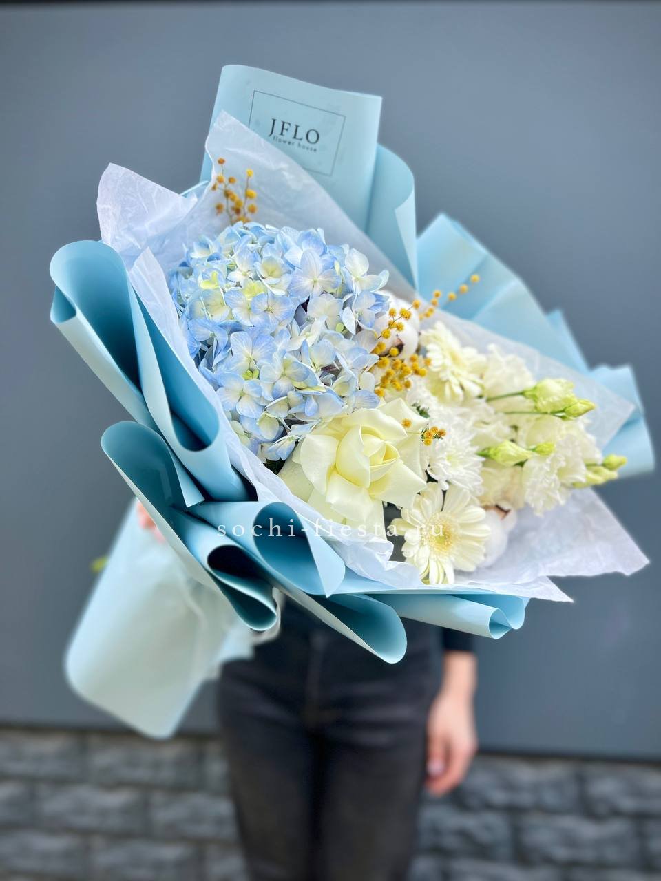 гортензия, белые розы, гипсофилы (или мимоза), эустомы, герберы, хлопок, лента и дизайнерская пленка.