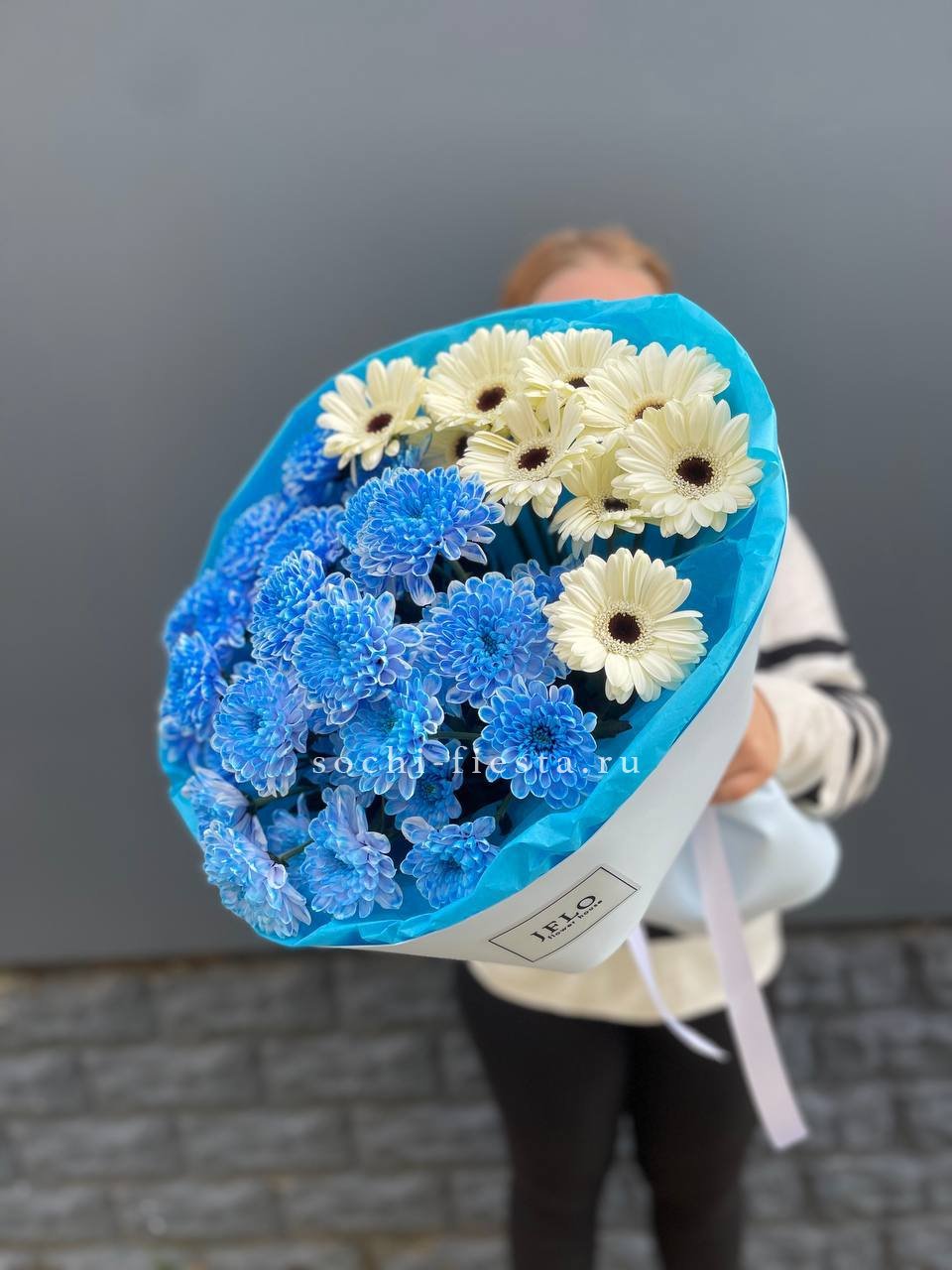 хризантемы, герберы, упаковка, лента.