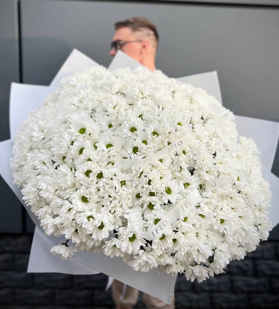Сто одна хризантема выстраивается в масштабную композицию с впечатляющим присутствием. Плотная структура и высота создают эффект цветочной инсталляции в пространстве.