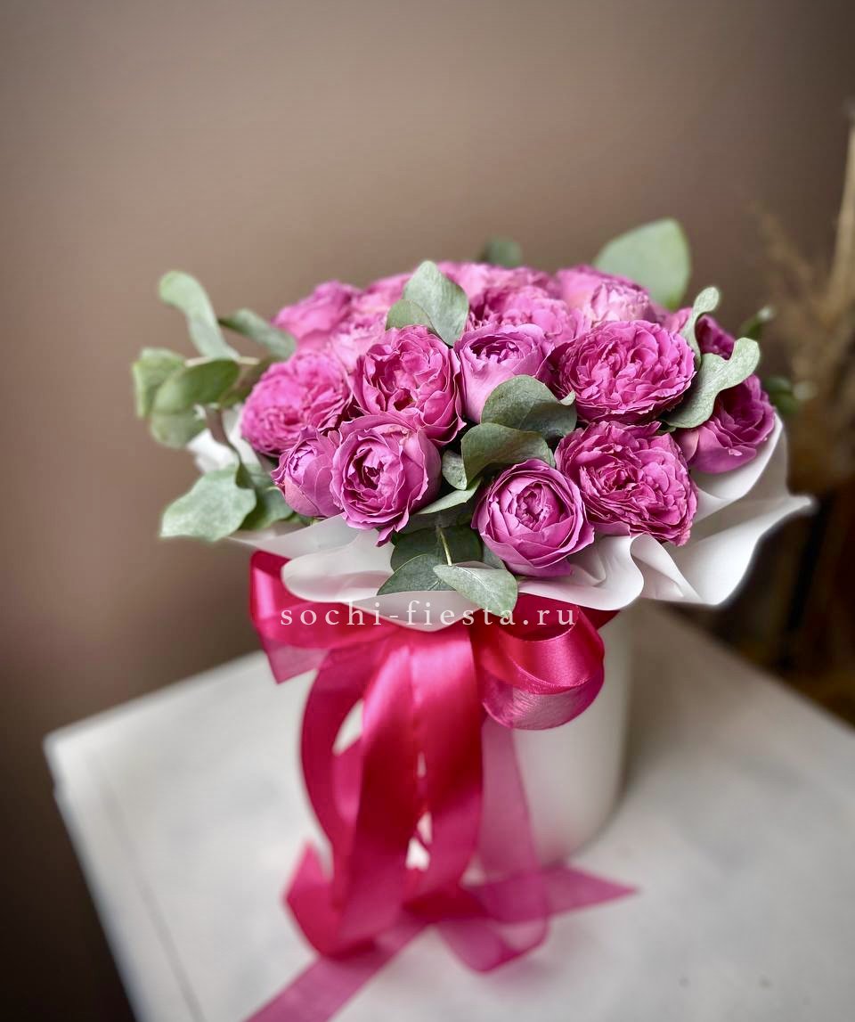 Пышная гортензия соседствует с крупными бутонами роз и многослойной эустомой. Веточки эвкалипта придают свежесть всей композиции. Букет с выразительным объемом и природной гармонией форм.