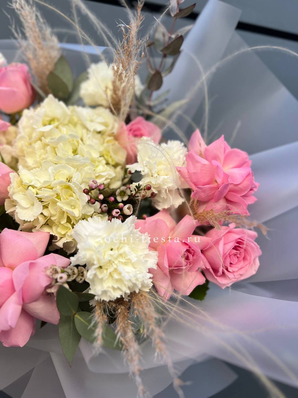 диантусы, эустома, красные розы, эвкалипт, пленка.