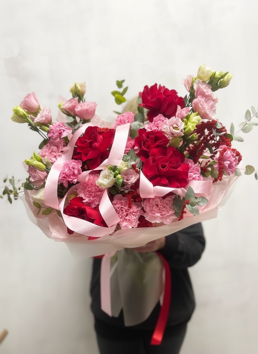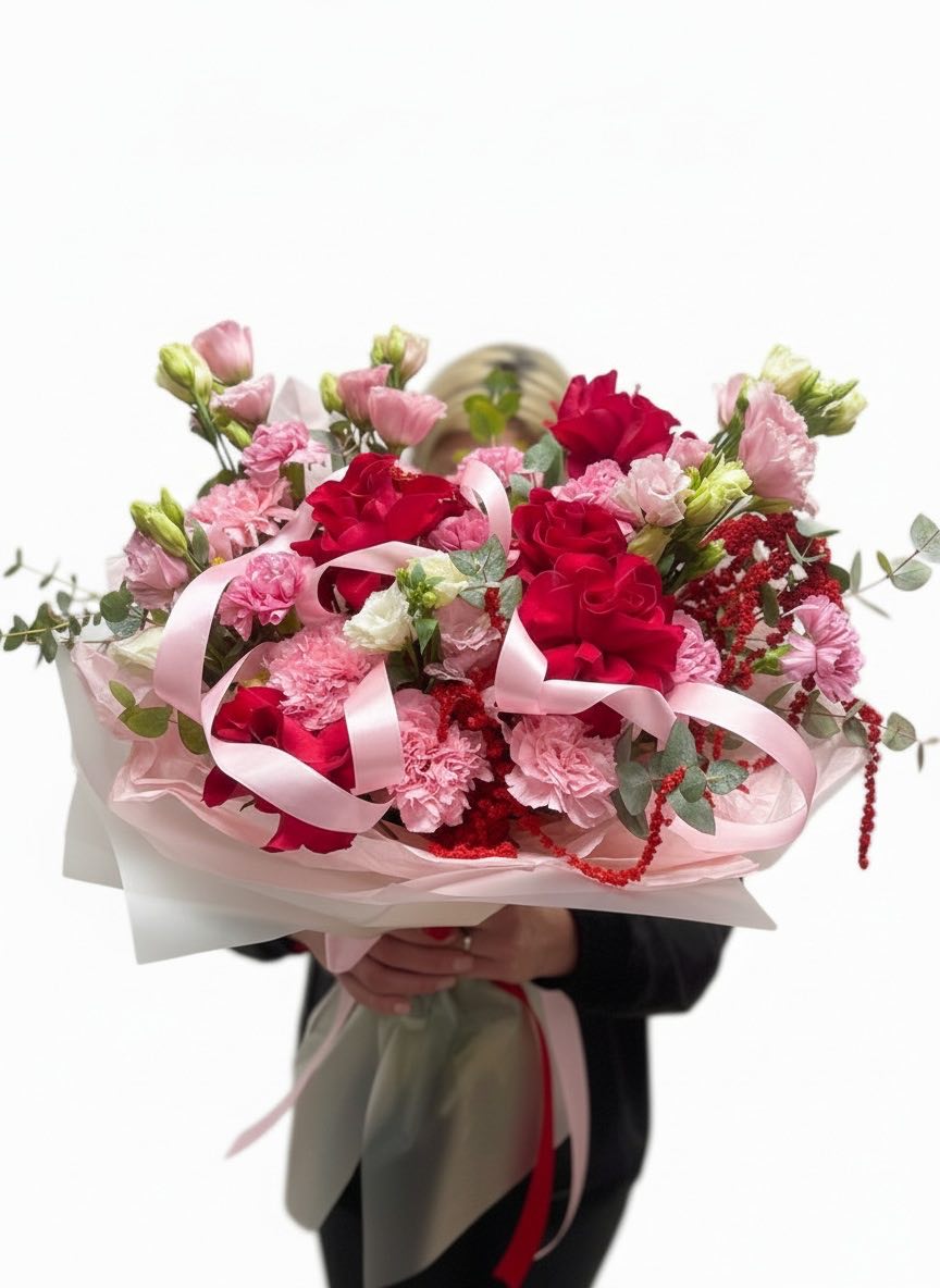 Этот пышный авторский букет в красно-розовых тонах представляет собой гармоничное сочетание страсти и нежности.