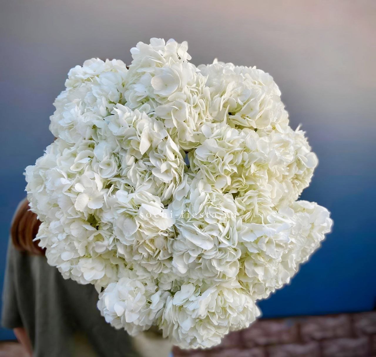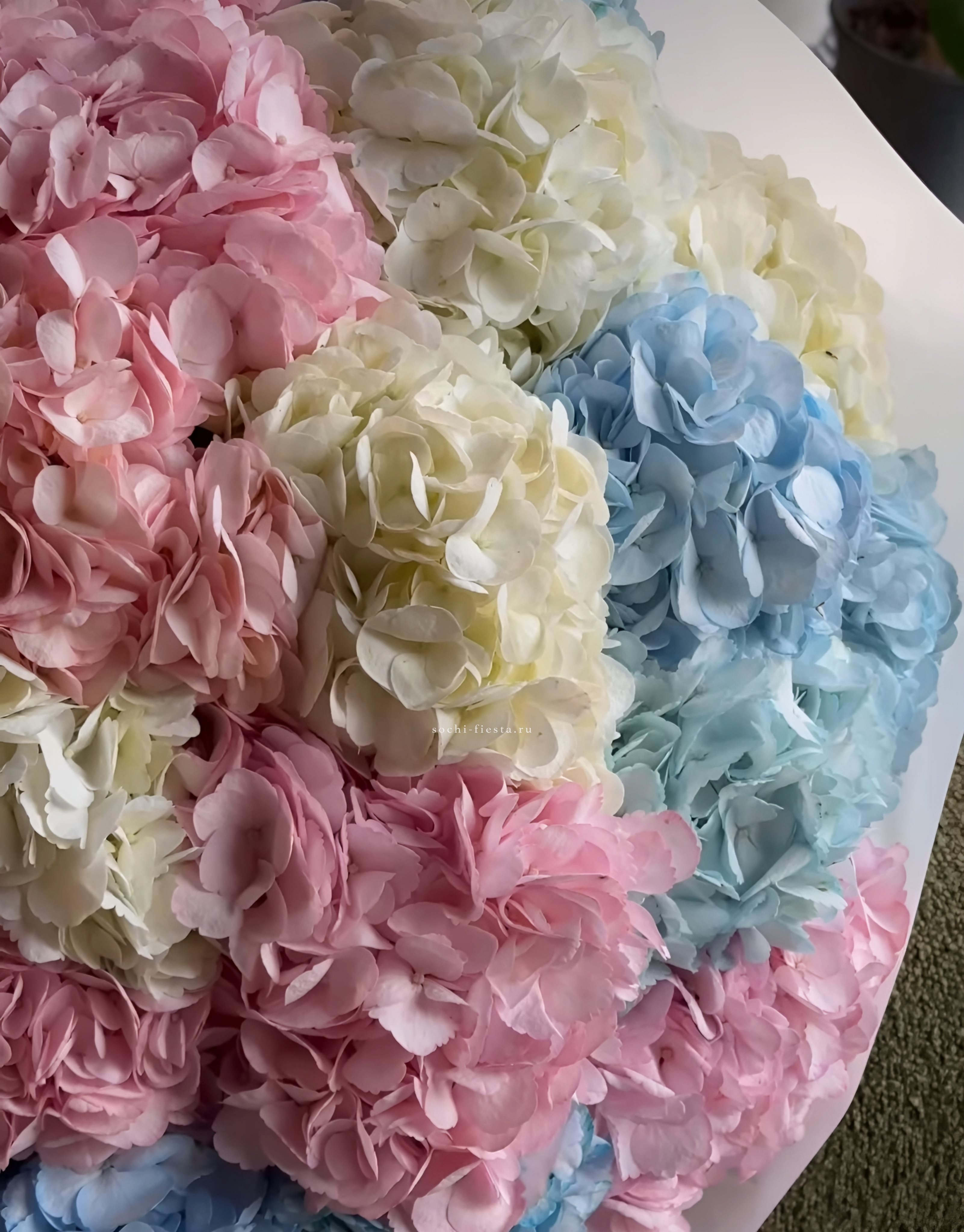 Двадцать пять соцветий гортензий разных оттенков формируют пышное облако с естественной игрой цвета. Каждая головка раскрывается по-своему, создавая живую фактуру без четких границ между тонами.