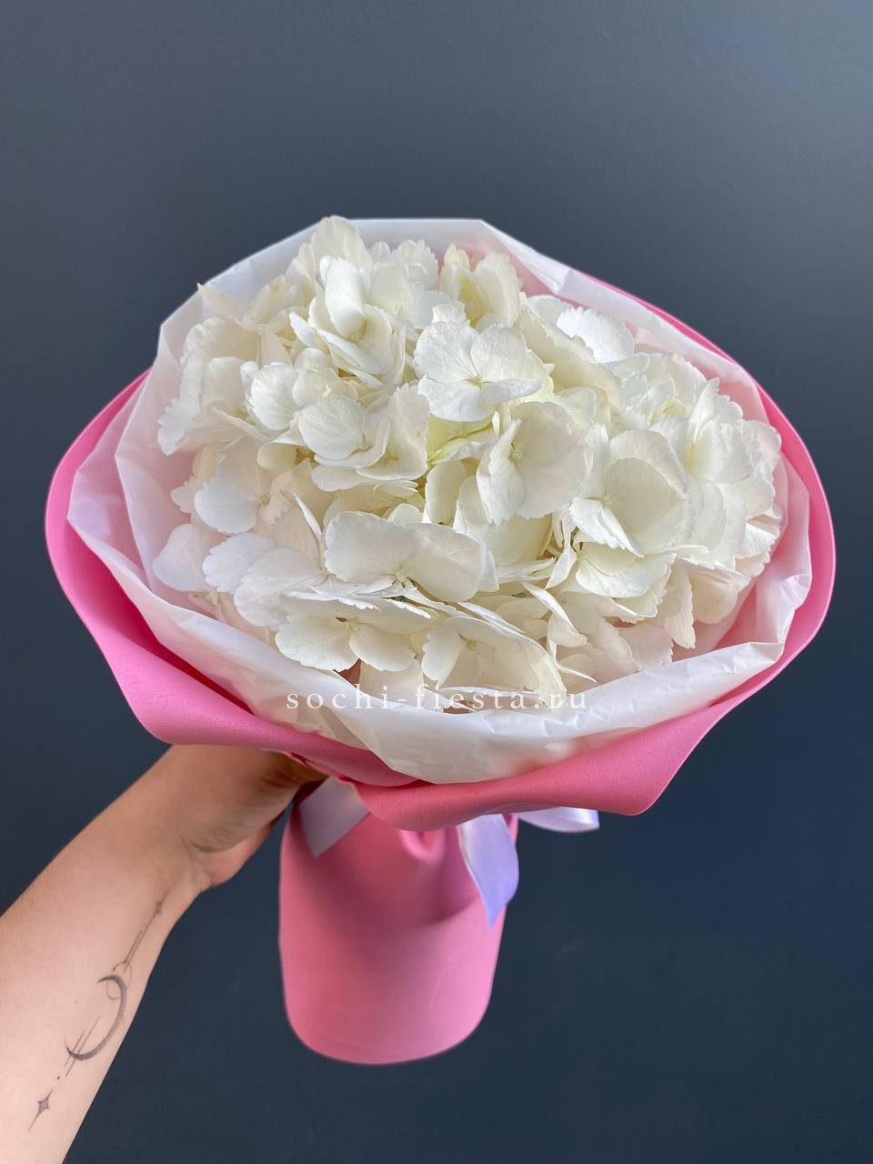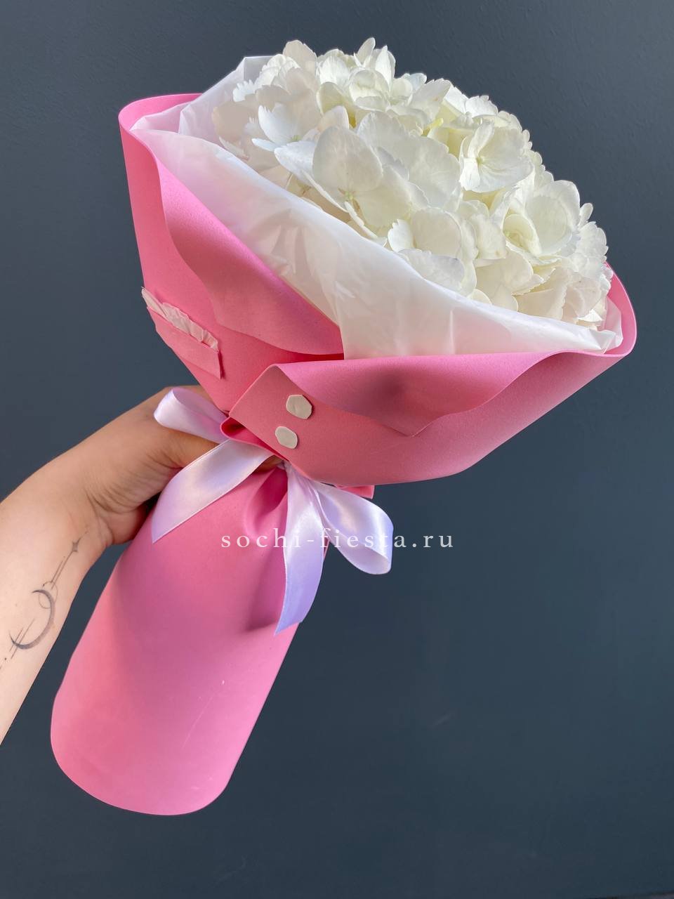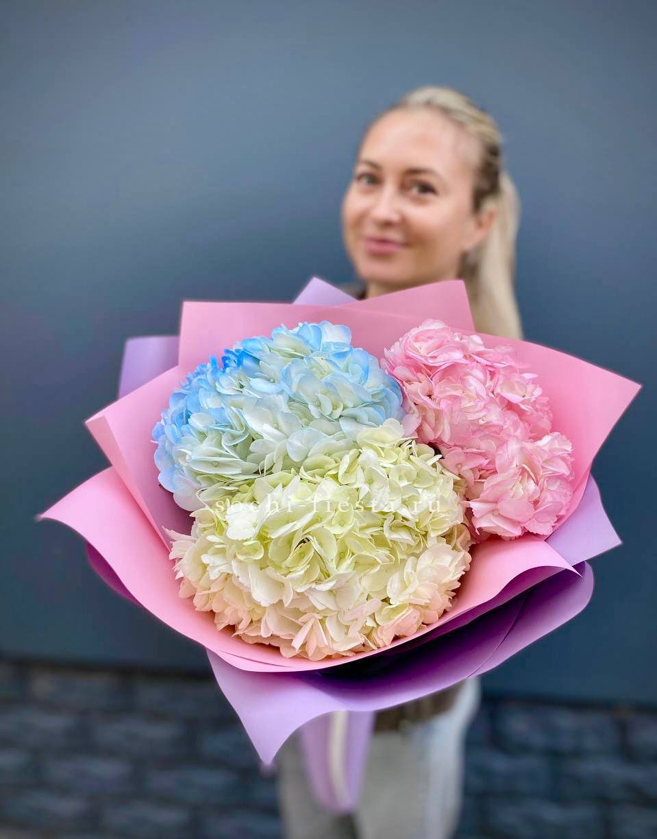 гортензия, лента, дизайнерская упаковка. Цвет гортензии на выбор