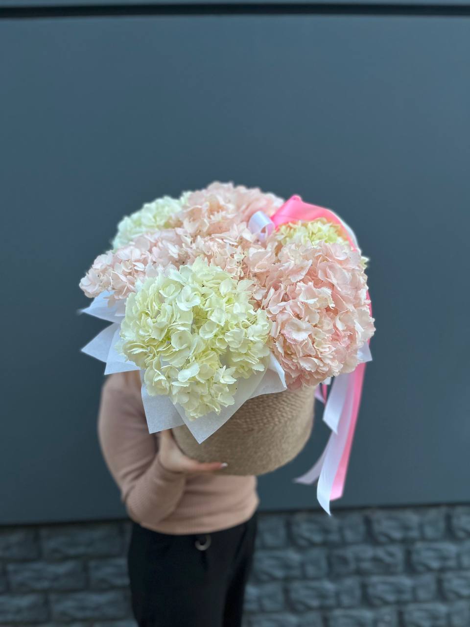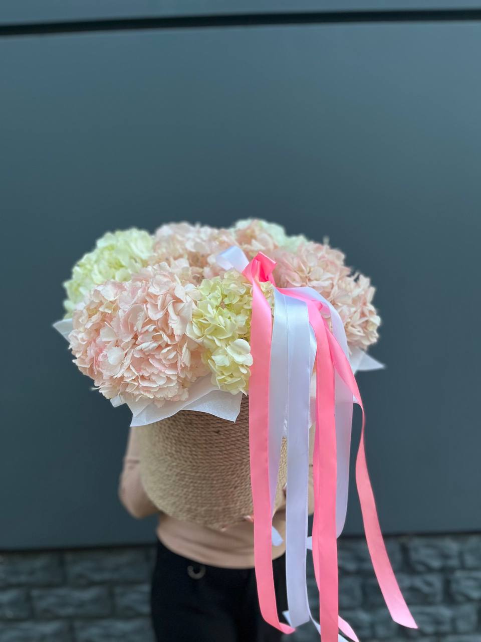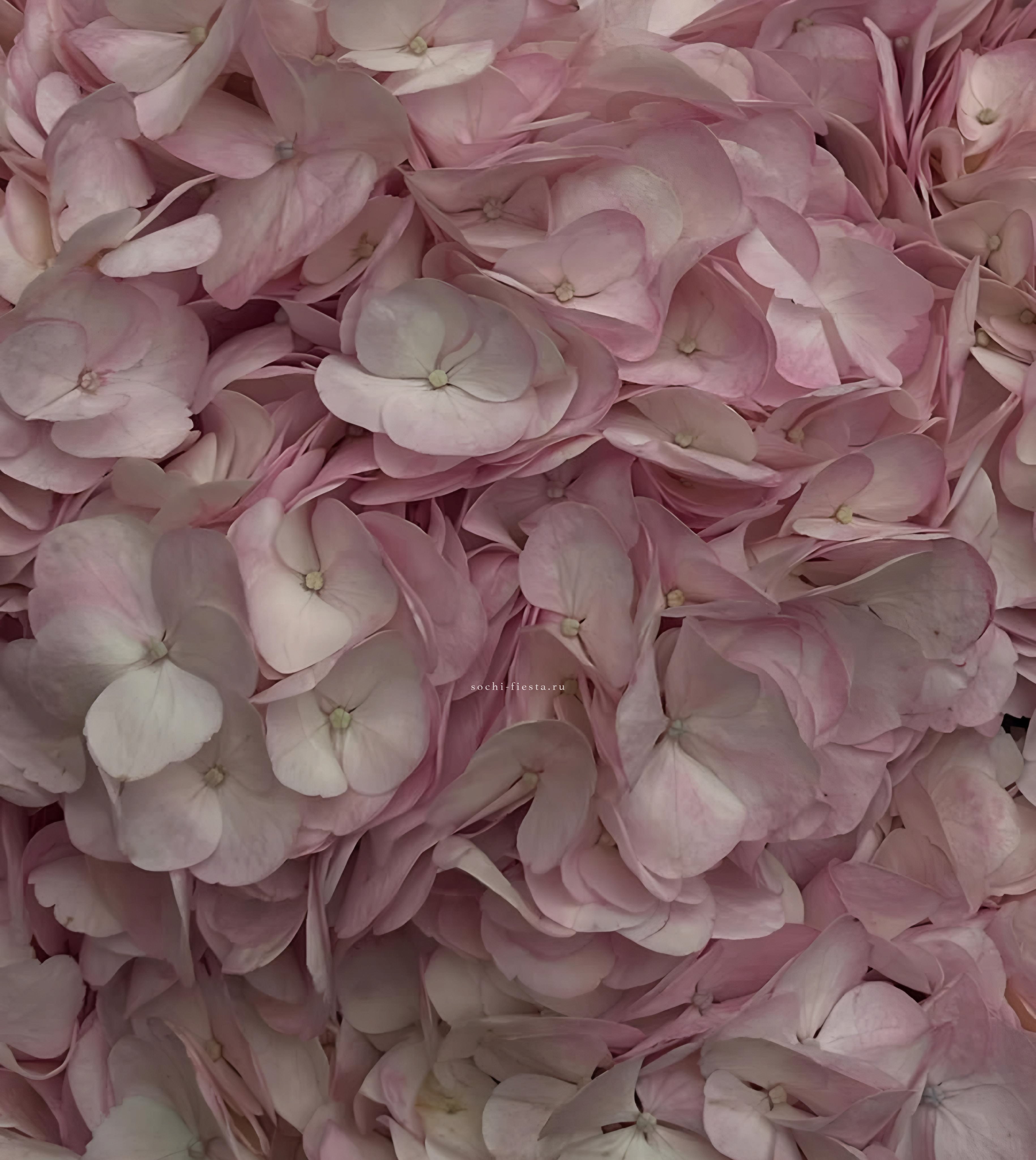 Пышные шапки розовой гортензии собраны в объёмную охапку, где каждое соцветие создаёт мягкую фактурную волну. Оттенок варьируется от пудрового до насыщенного ягодного, формируя живописную глубину.