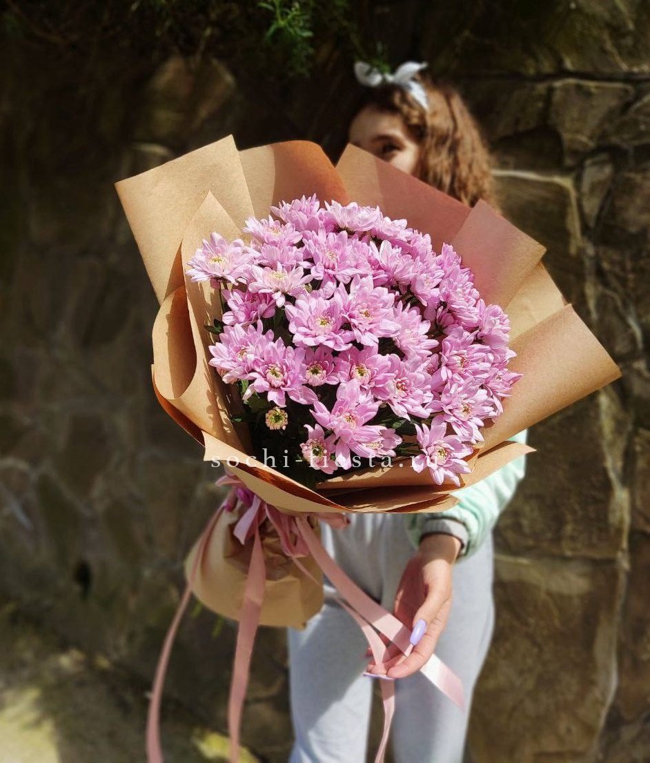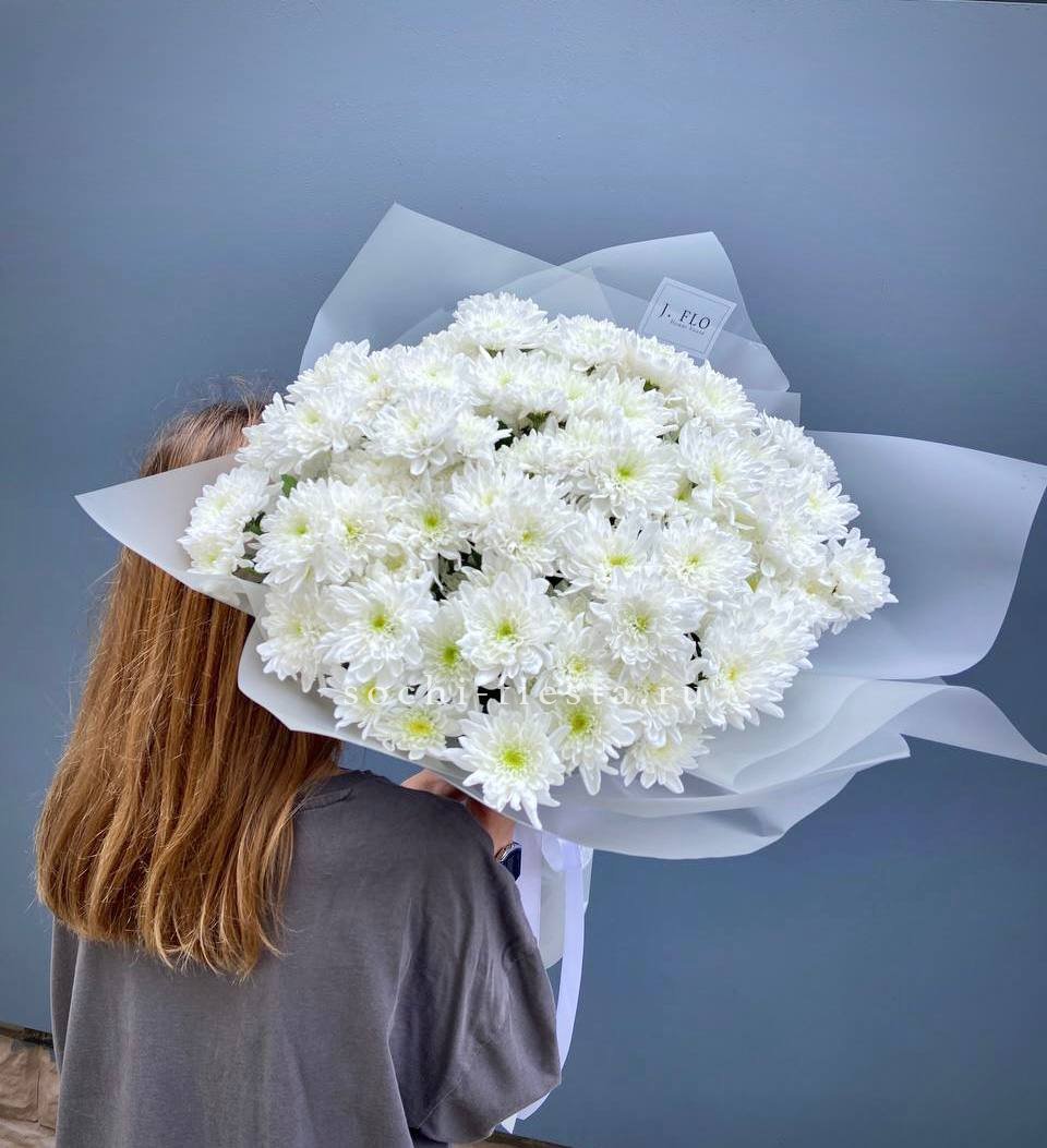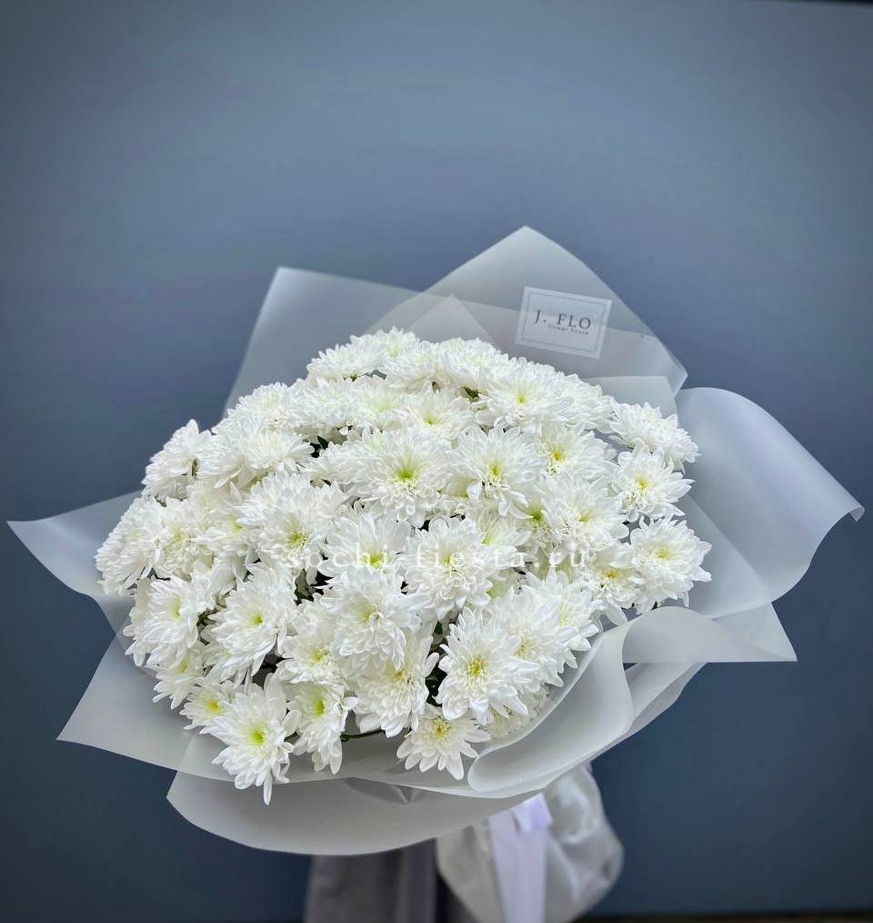Девять кустовых хризантем собраны в плотный круглый силуэт. Каждая ветка раскрывается веером мелких соцветий, создавая объёмную текстуру. Букет держит форму и выглядит графично.