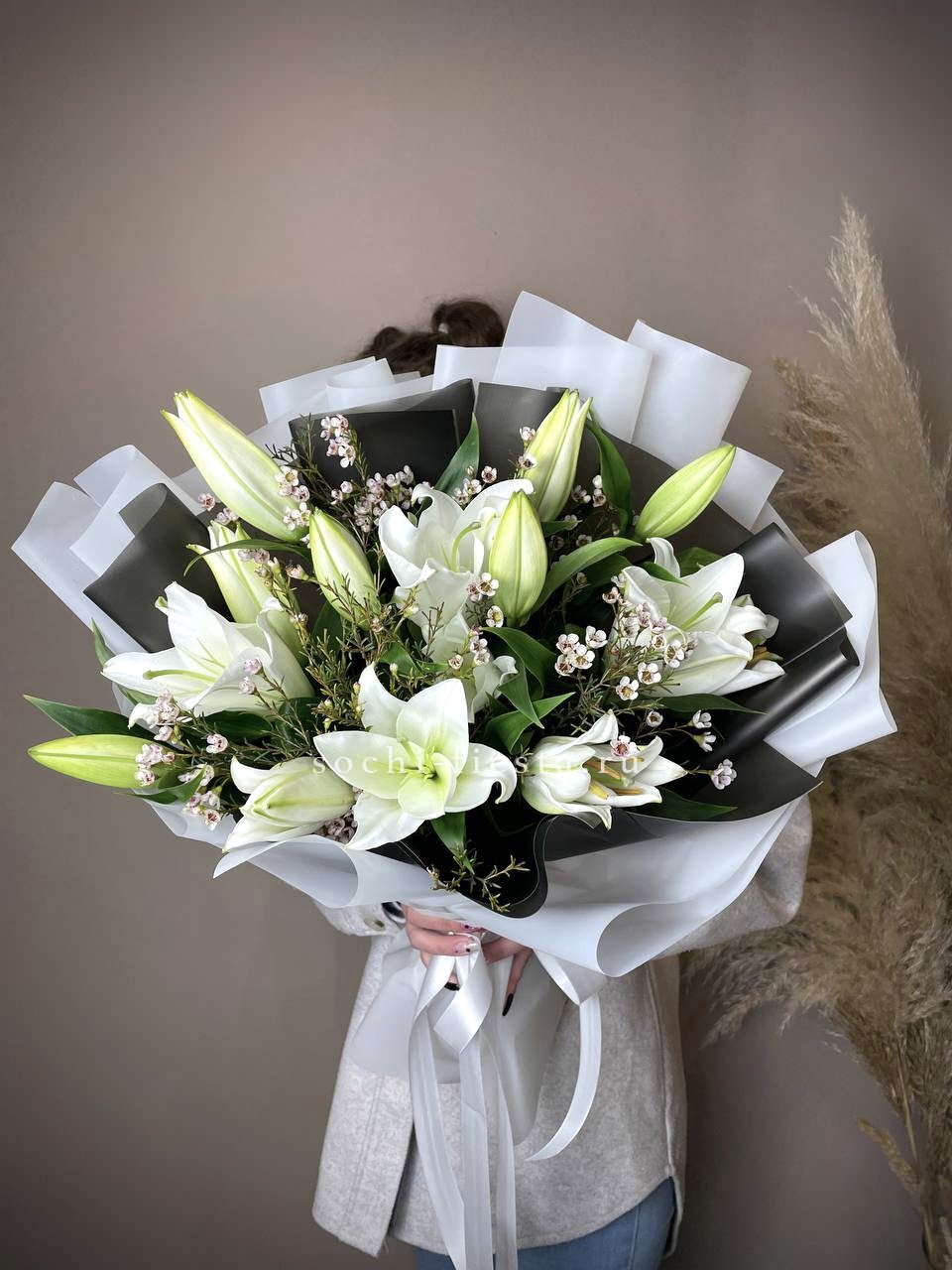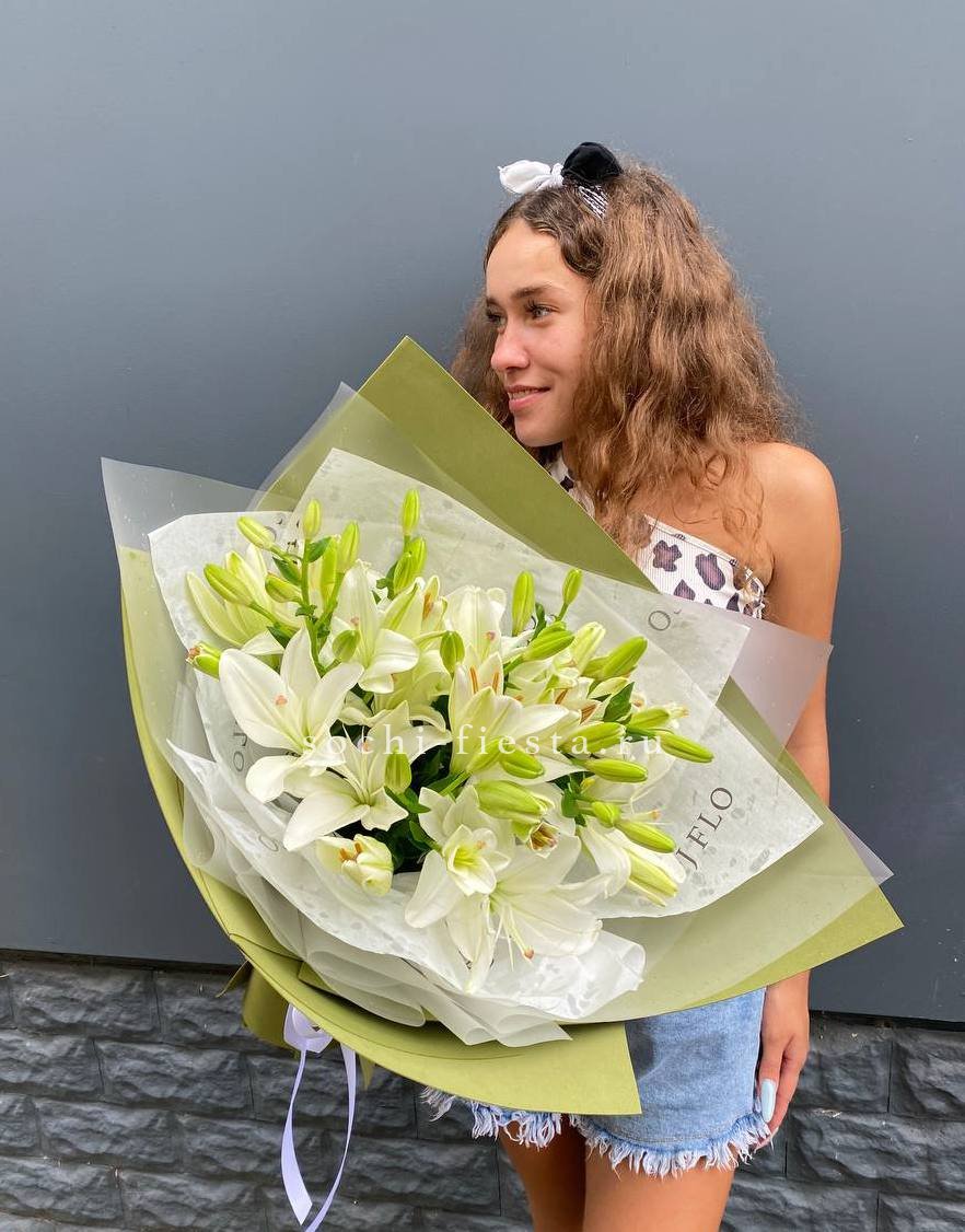 Пять белых лилий в крафтовой обёртке — классика без лишних деталей. Бутоны крупные, с выраженной фактурой лепестков и насыщенным ароматом. Простая форма букета подходит для любого повода и интерьера.