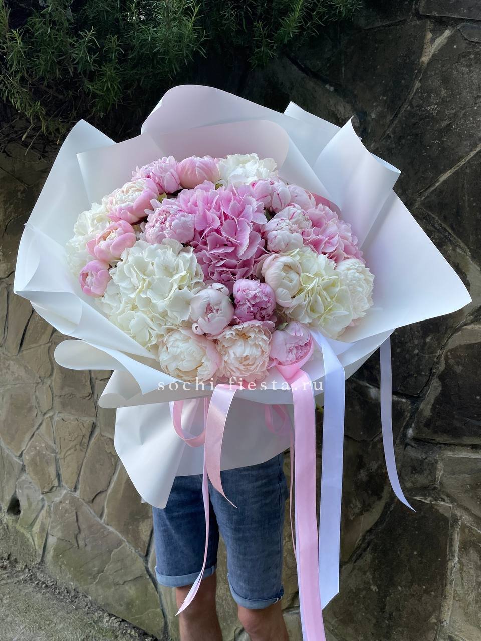 голландские пионы, гортензии, лента, упаковка.