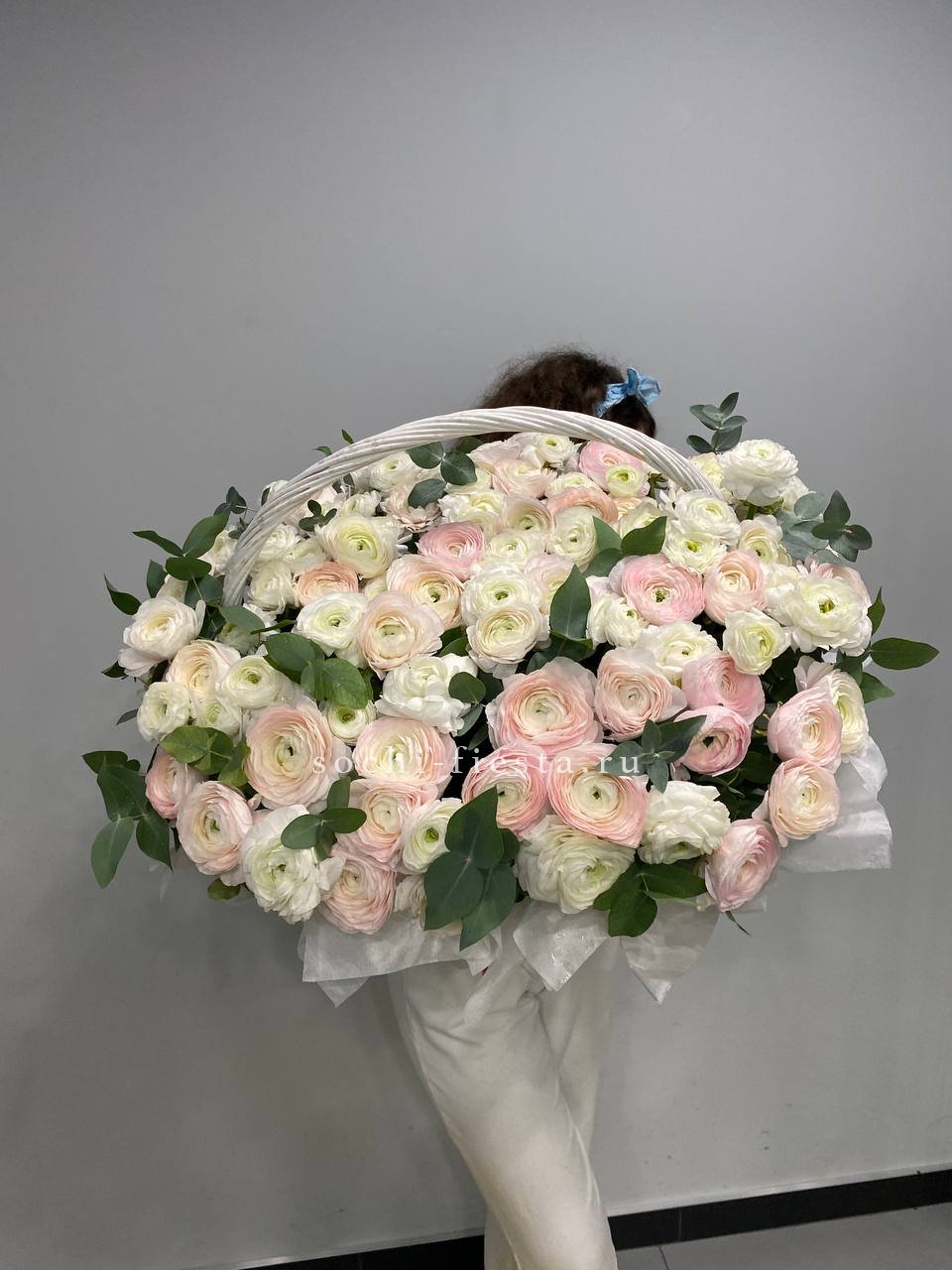 на фото 113 ранункулюсов микс  с эвкалиптом в корзине Вы можете согласовать с менеджером любое количество) Такой объём лучше заказывать за 1.5 недели)