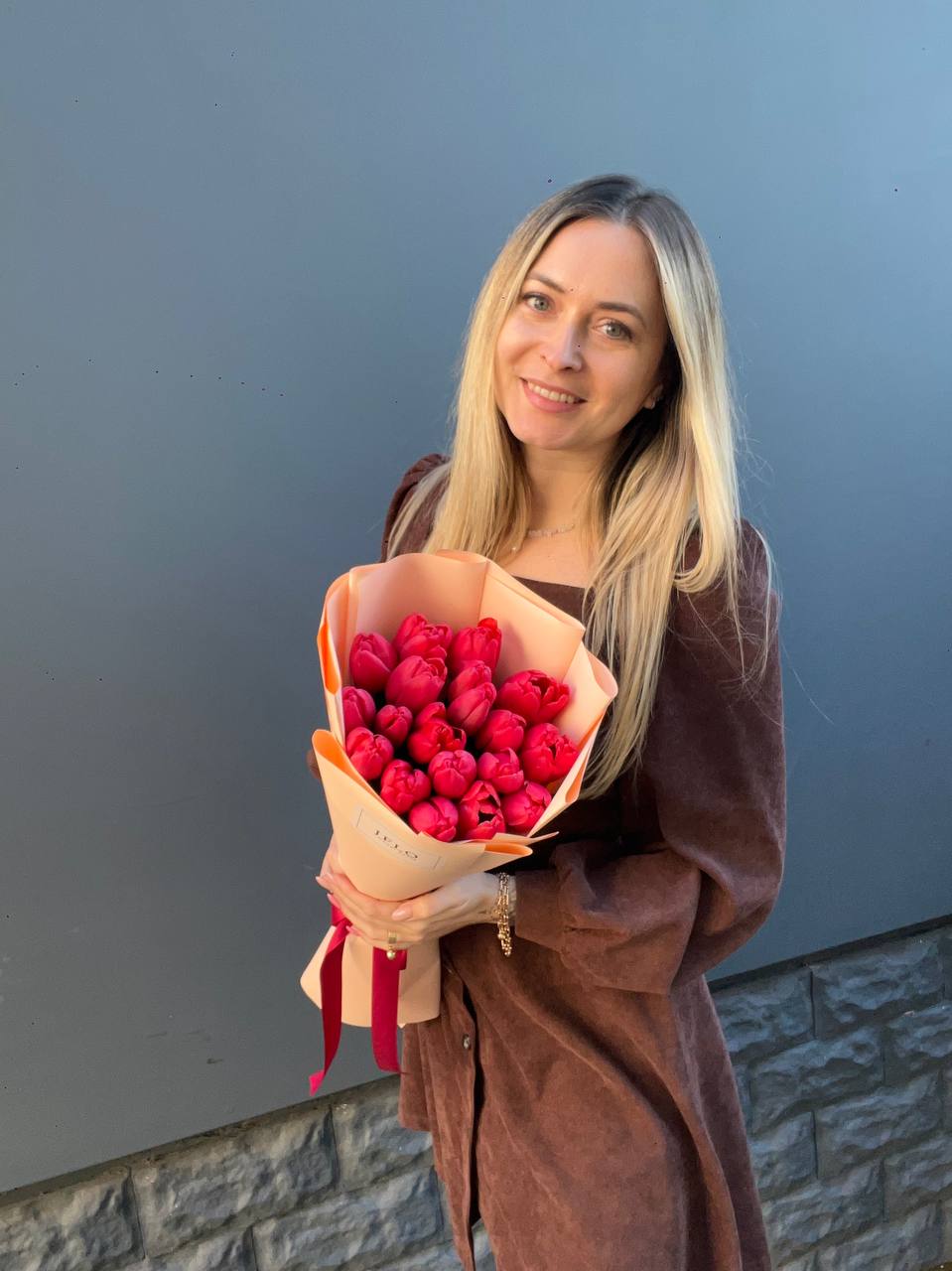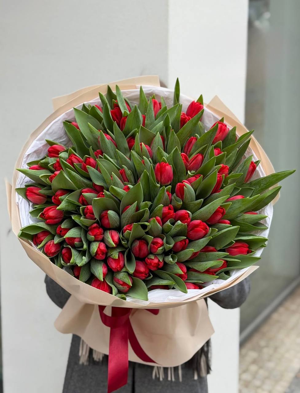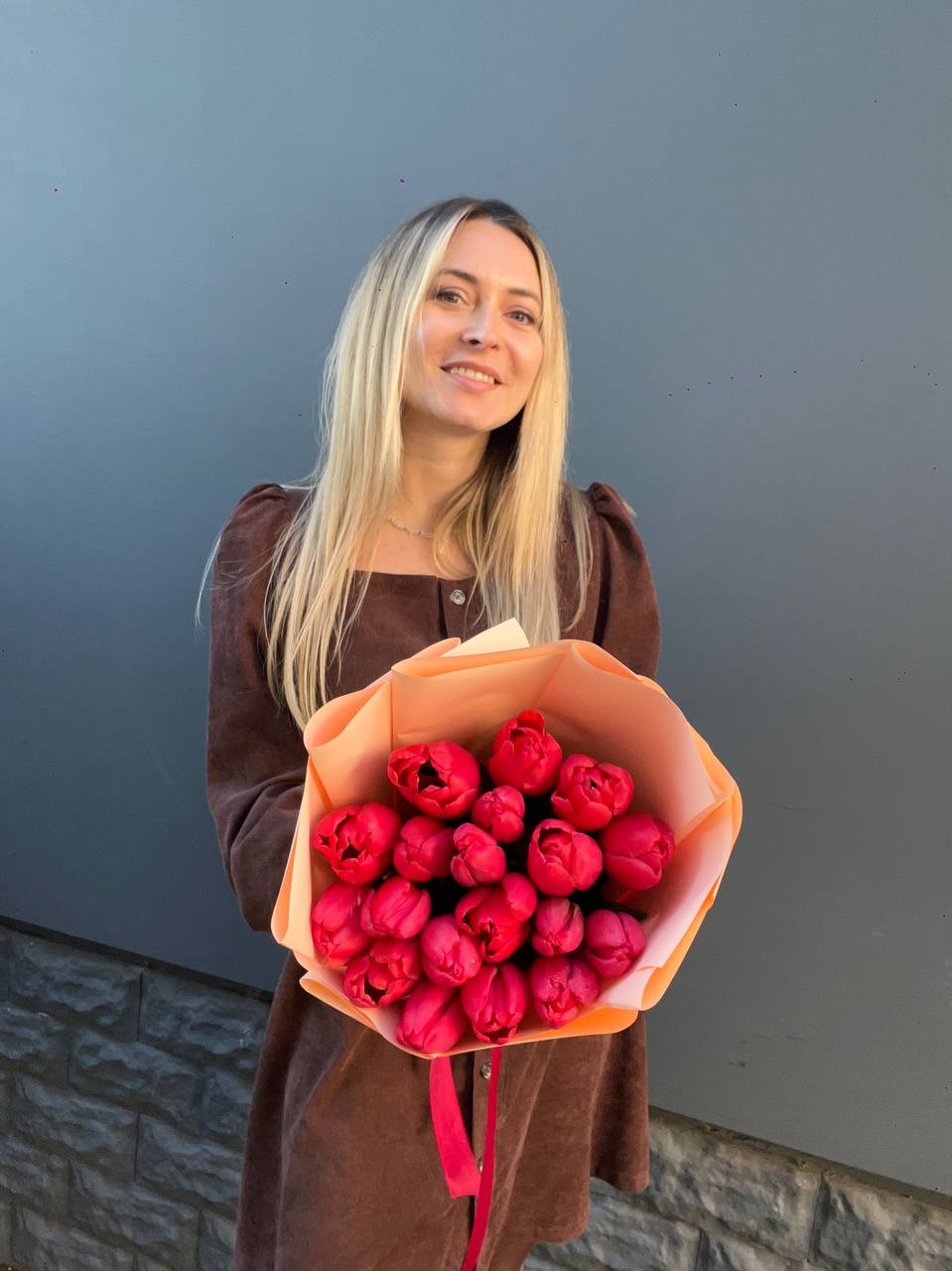 Пятнадцать бутонов собраны в плотную группу и упакованы в прозрачную пленку. Красный оттенок лепестков создает яркое цветовое пятно, которое сразу привлекает внимание. Тюльпаны сохраняют свежесть долго и не требуют сложного ухода.