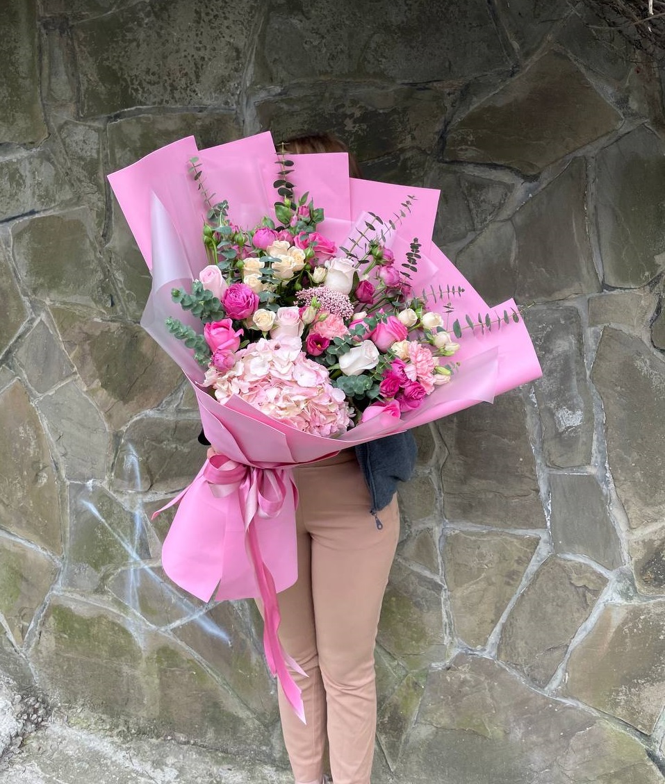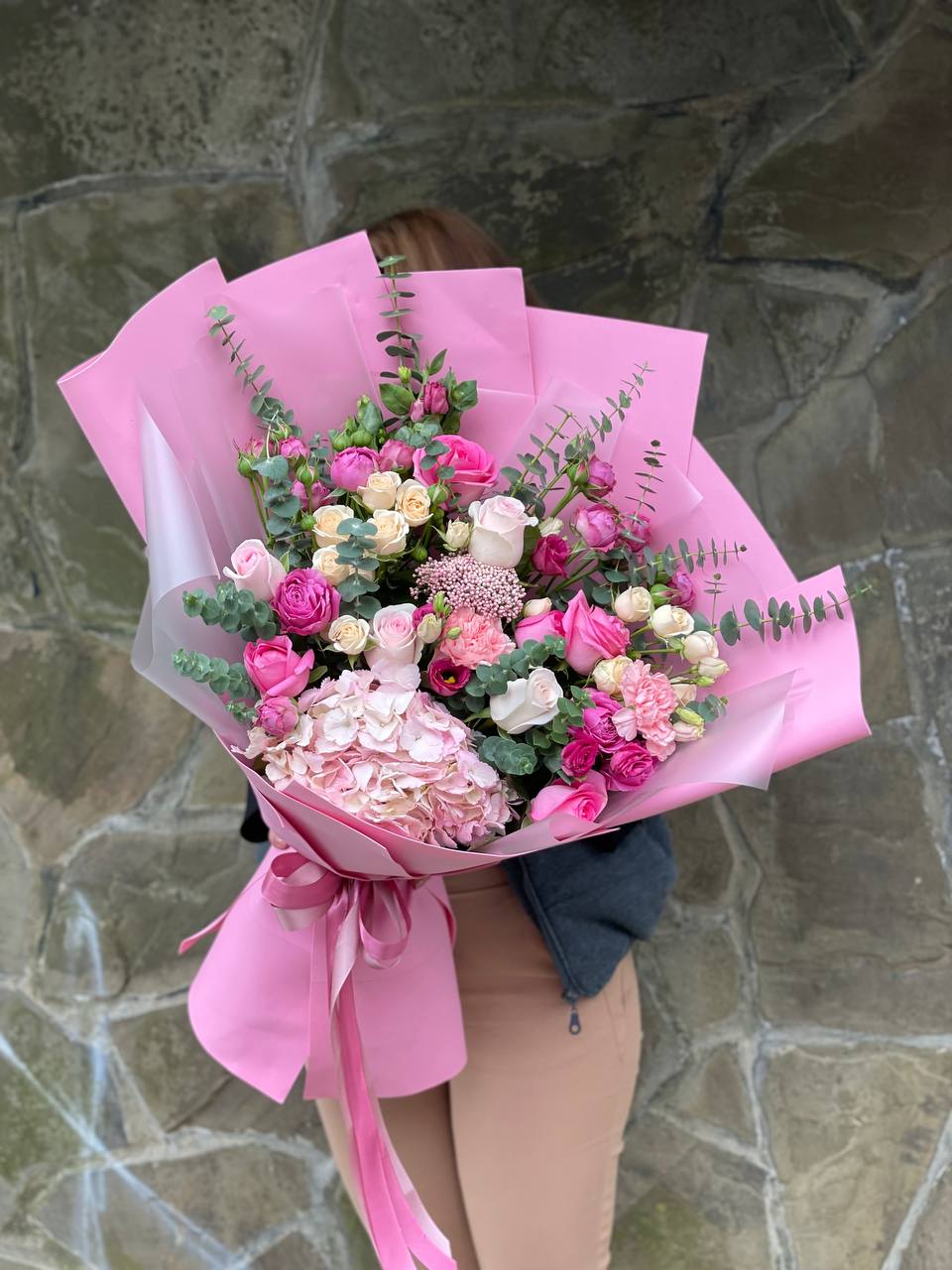 Гортензии и пионы задают основной объем, пионовидные розы добавляют мягкости, а маттиола вносит вертикальные линии. Букет выглядит наполненным и цельным.
