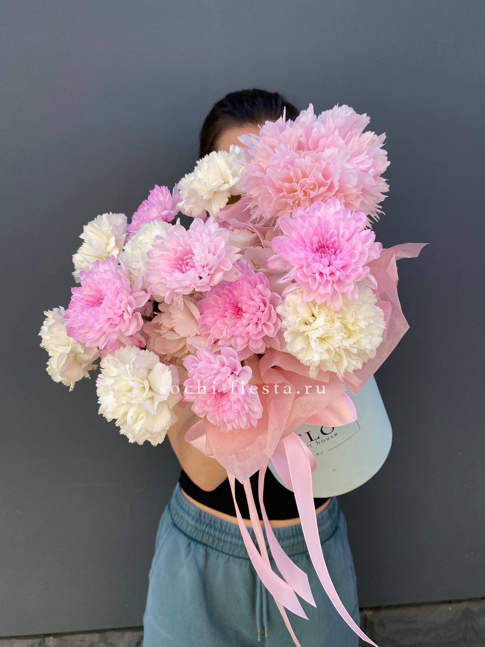 гортензия, диантус, роза, кустовая роза, эустома, эвкалипт, лента, авторская упаковка.