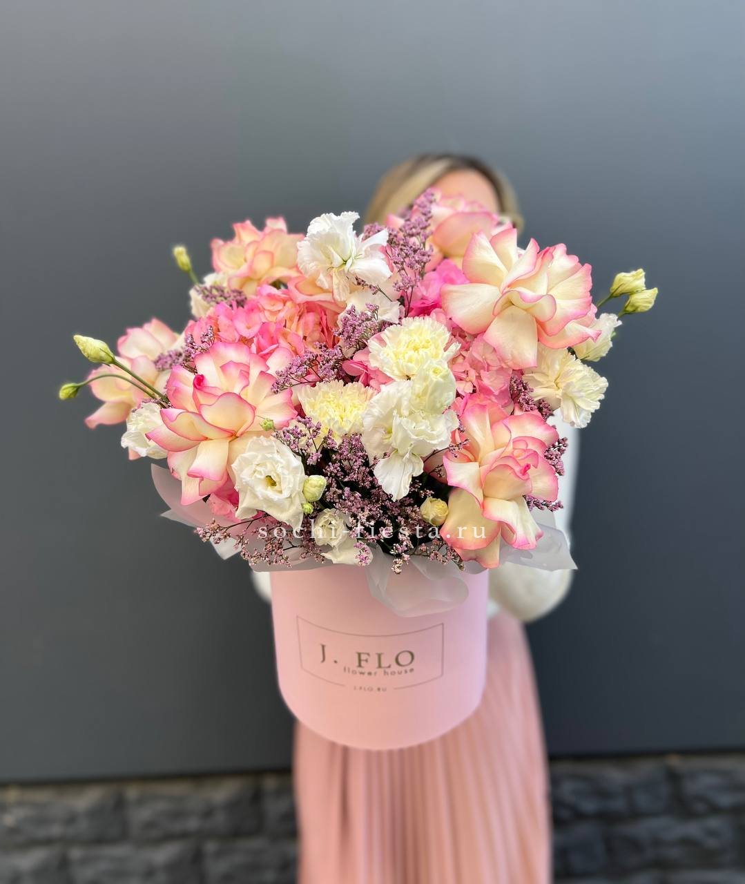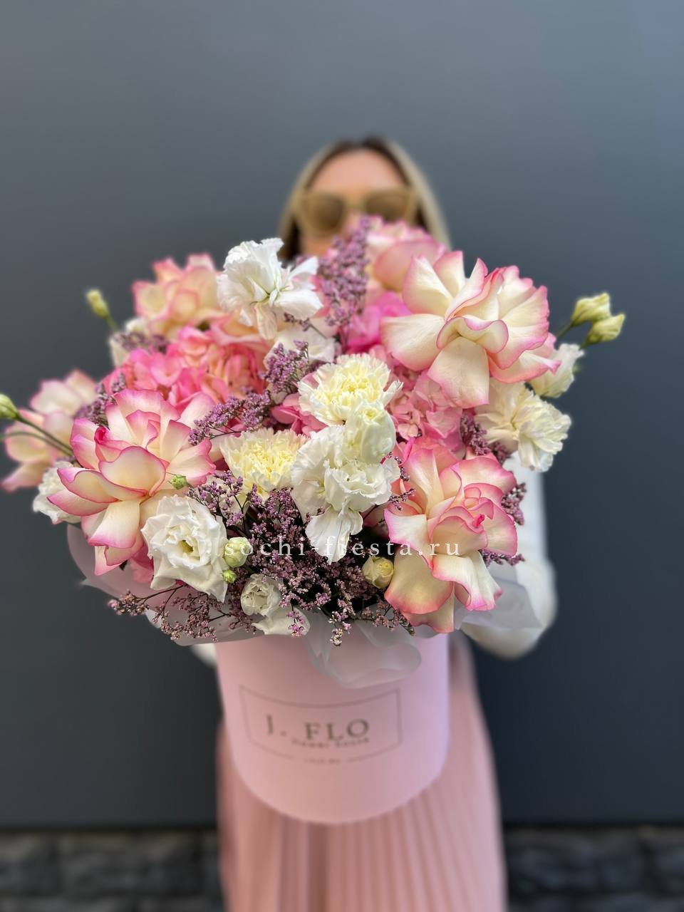 Микс из пионов, лилий и эустом в объёмном цилиндре создаёт впечатление пышного сада. Белые розы и маттиолы наполняют пространство светом, а статица добавляет графики.