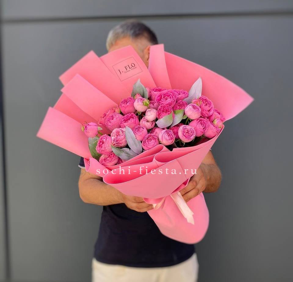 розовая роза, пионовидная роза, диантус, эвкалипт, лента, сумка-кашпо.