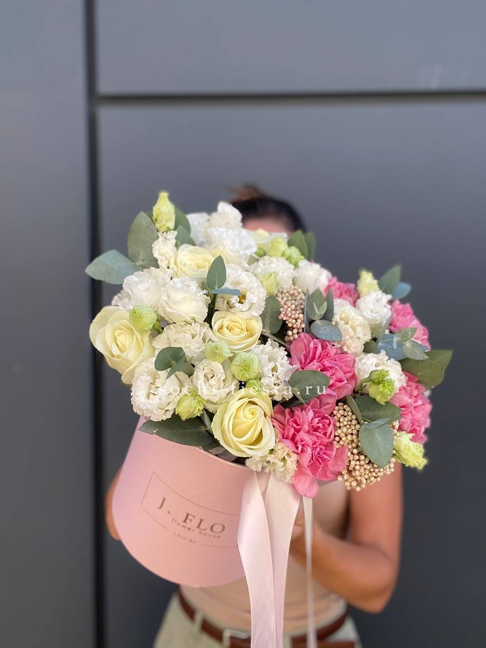 герберы, эустома, белая роза, эвкалипт, лента, сумка-кашпо.