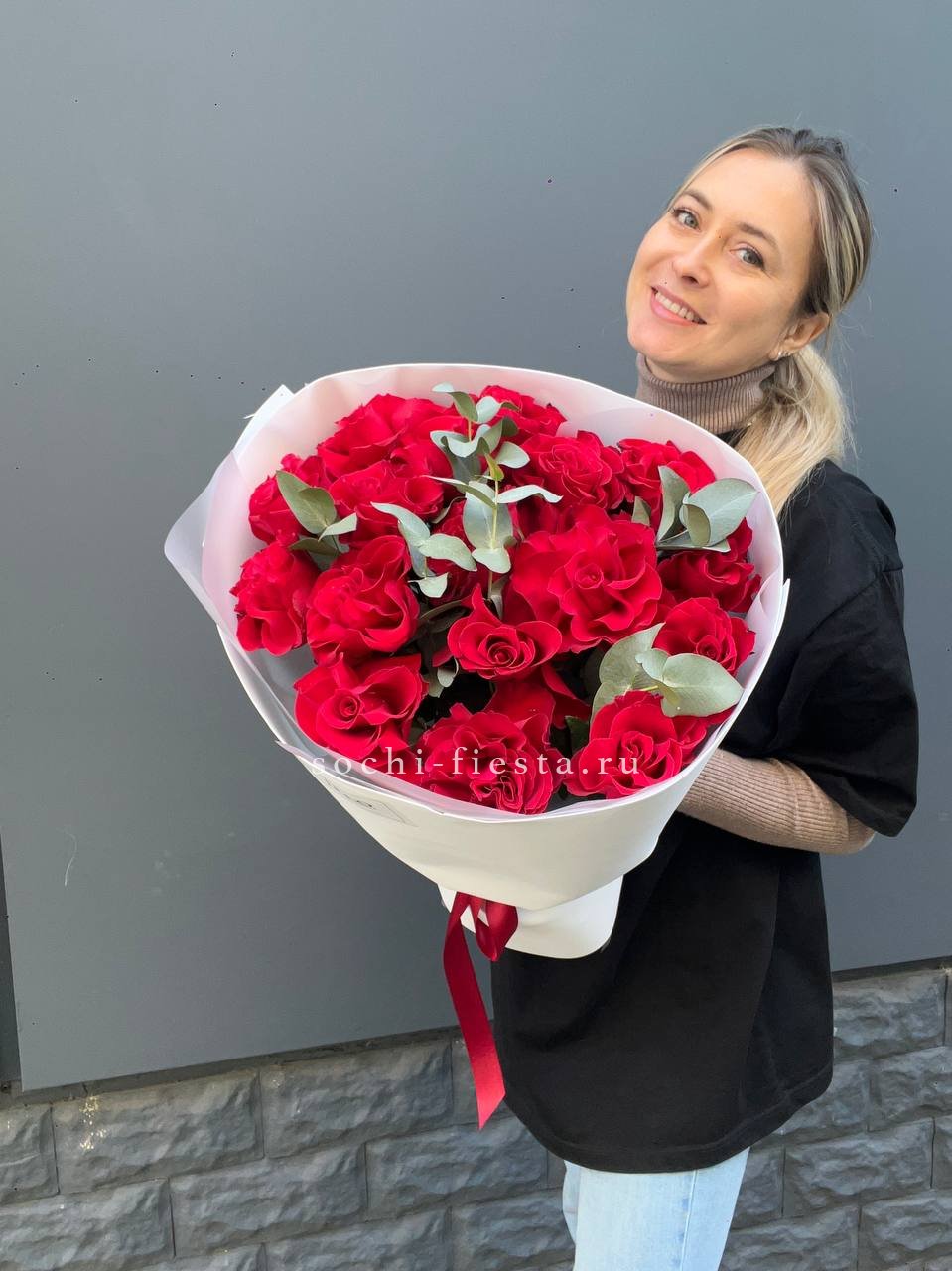 Пятнадцать вывернутых бутонов белого цвета раскрываются объемными шапками с волнистыми краями лепестков. Ветви эвкалипта добавляют букету воздушности и создают мягкую зеленую дымку вокруг цветов.