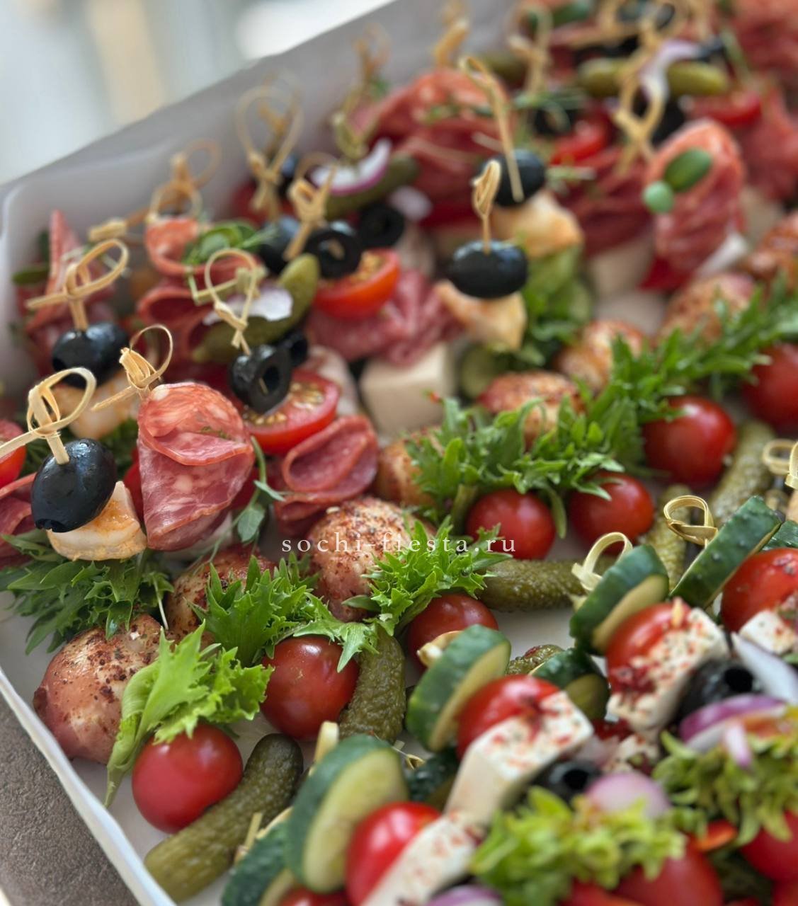 сезонные овощи с муссом из кальмара и авокадо. Щедро уложены в несколько слоев. Вес 2-2,5 кг. Бокс рассчитан на 8-10 персон.