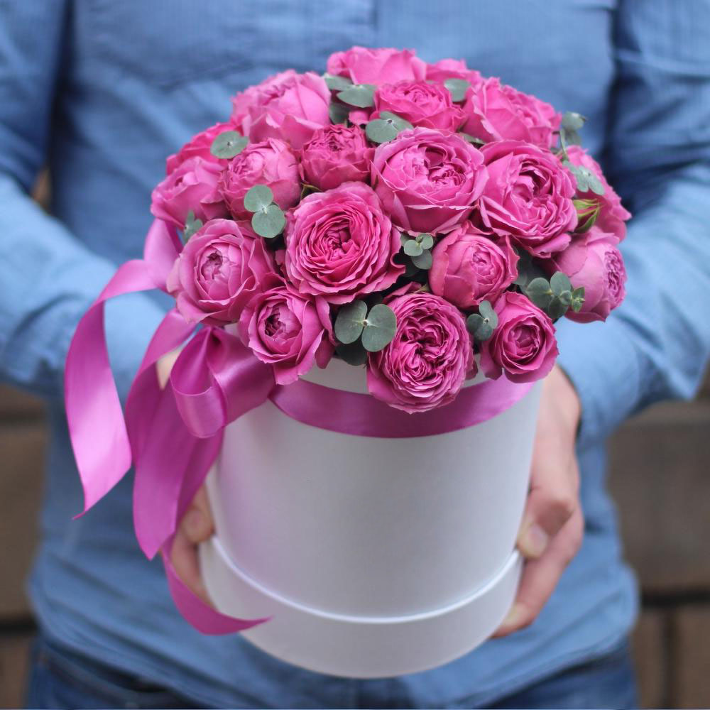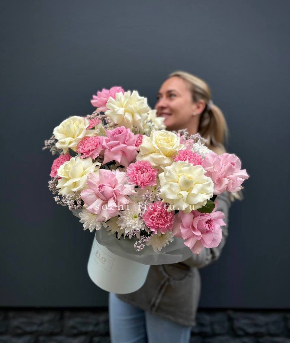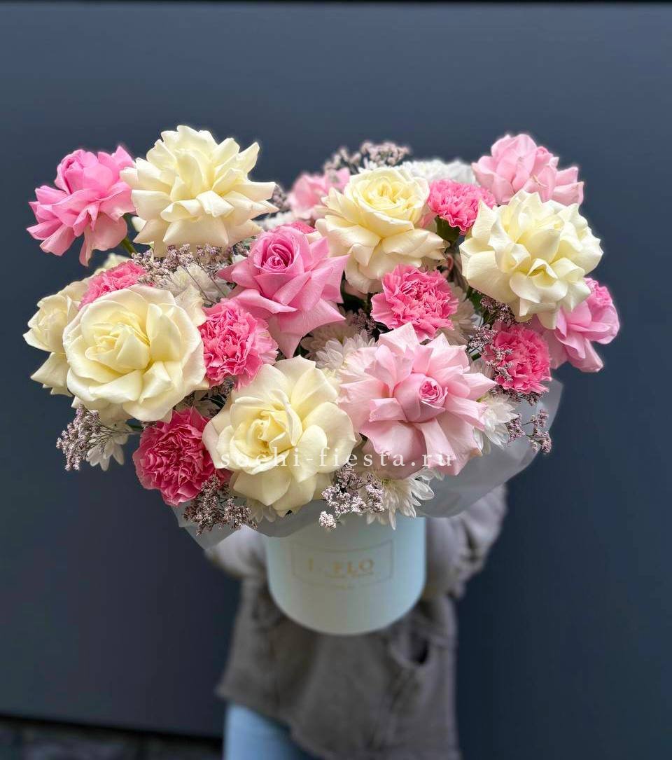 Для заказа товара "Коробка французских роз и диантусов "Бони"" с доставкой в Королёве нажмите в корзину