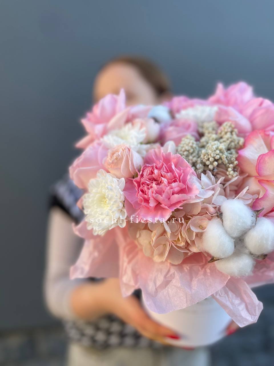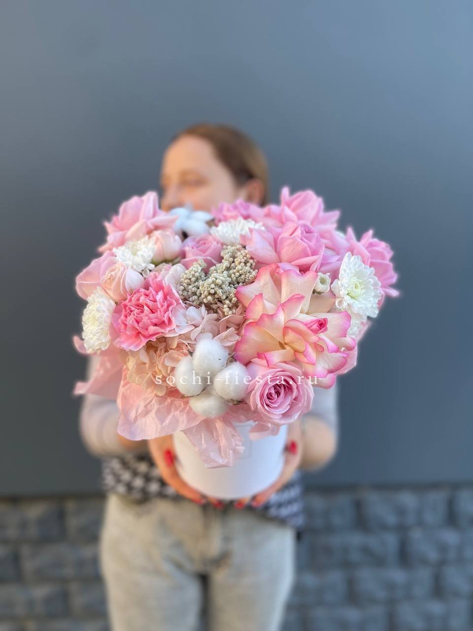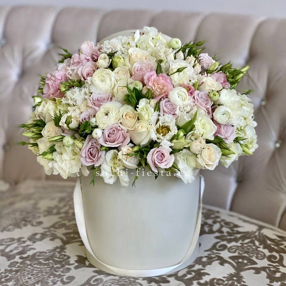 гортензия, розы, озотамус, диантус, бомбастик, хлопок, хризантема бокс 16.