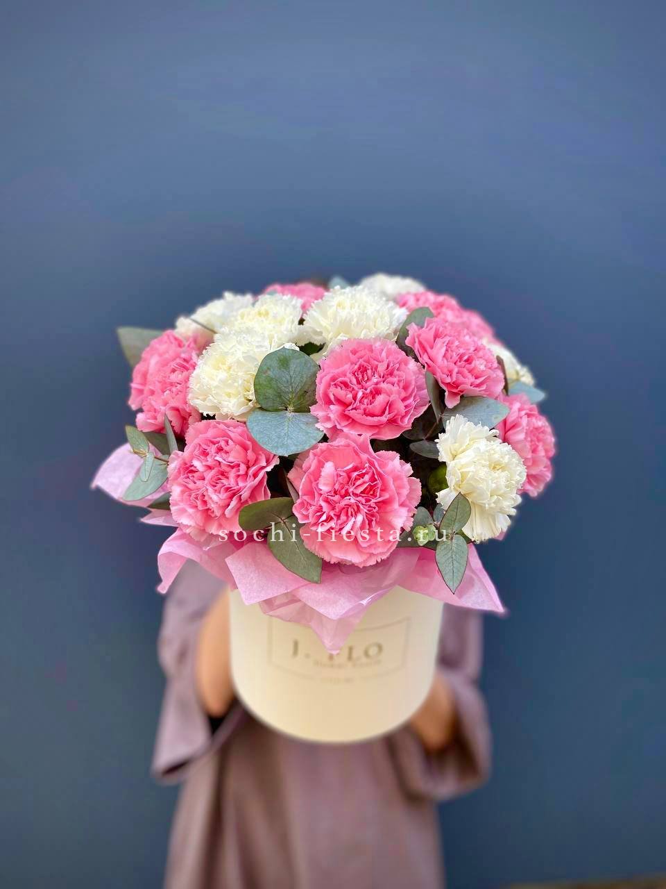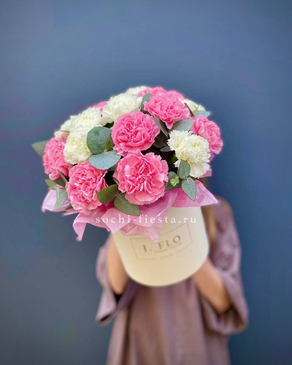 пионовидная роза сорта Мисти бабблс, эвкалипт в коробке или корзине.