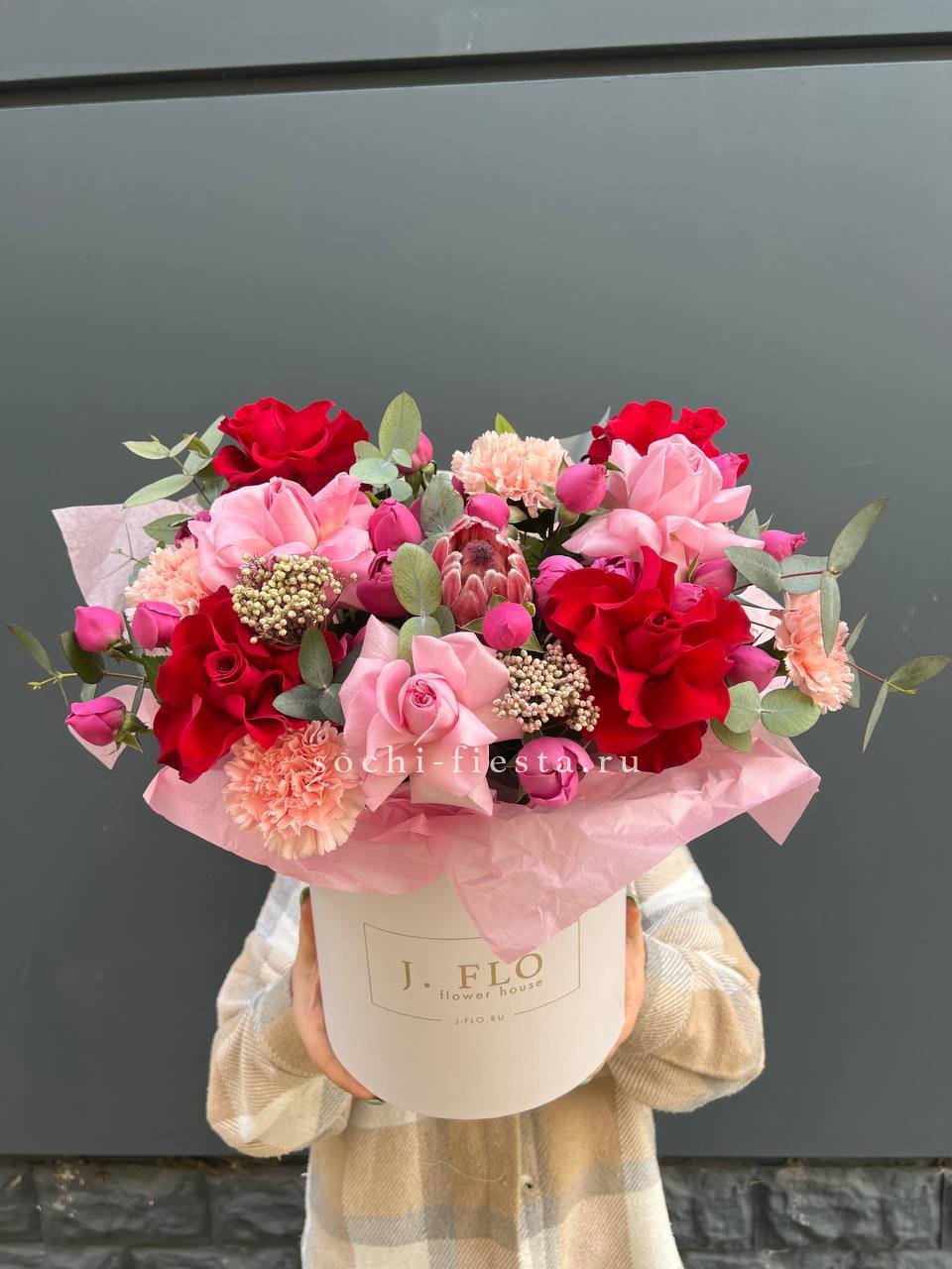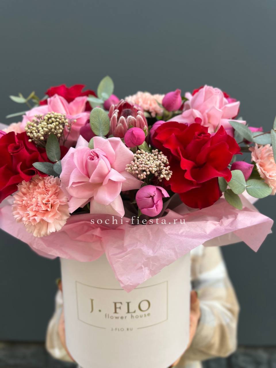 Редкий сорт Мисти Бабблс наполняет композицию глубокими оттенками и крупными бутонами. Эвкалипт оттеняет пионовидные розы, создавая завершенный образ в просторной упаковке.