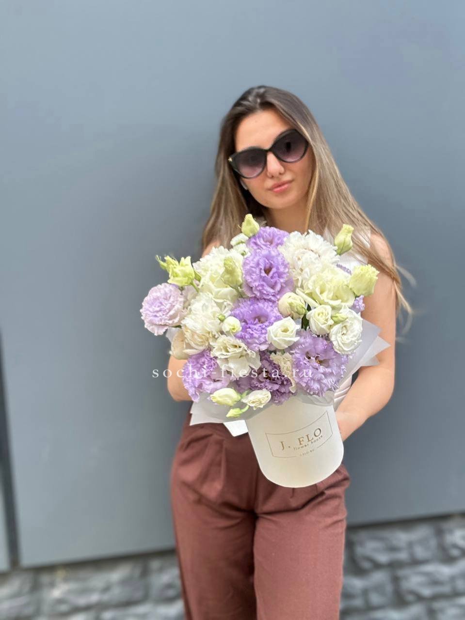 Эустома и пионы в цилиндре дают мягкое цветовое пятно с воздушной текстурой. Эвкалипт обрамляет композицию и добавляет свежую зелёную ноту общему впечатлению.