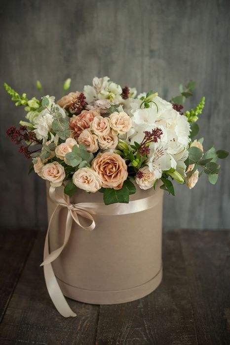 роза, диантус, пионы или гортензия, розы, бомбастик, эустома, декоративная зелень, цилиндр D16.