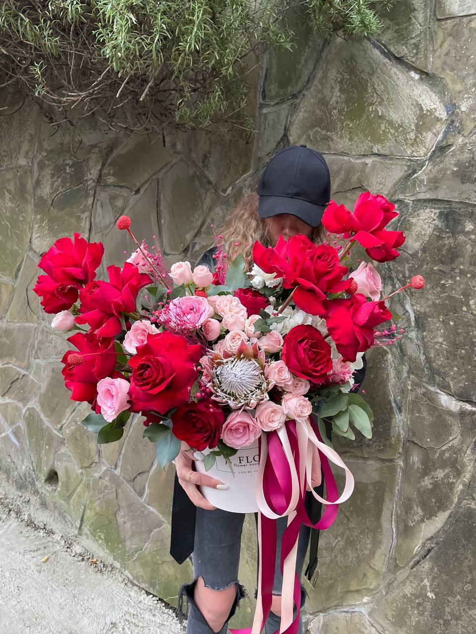 Композиция в боксе собрана на контрасте красных и розовых роз с экзотической протеей. Яркие бомбастики и воздушная гортензия создают объёмную текстуру, а сухоцветы добавляют графичности. Готовое решение для яркого поздравления.