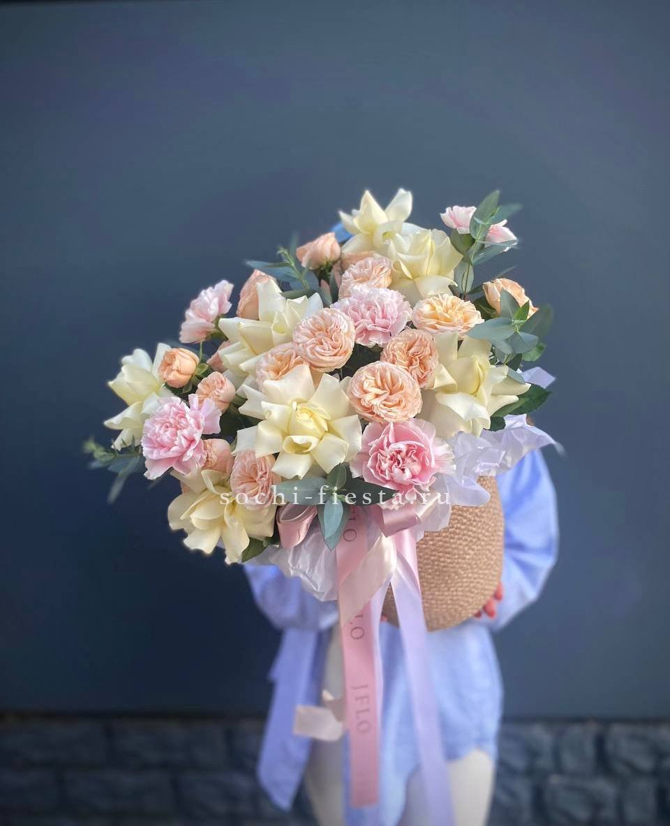 Мягкая палитра белых оттенков с вкраплениями диантуса создает воздушную композицию в натуральном джутовом кашпо. Кустовые розы добавляют объем, а эвкалипт завершает природную гармонию. Готовое решение для интерьера в спокойных тонах.