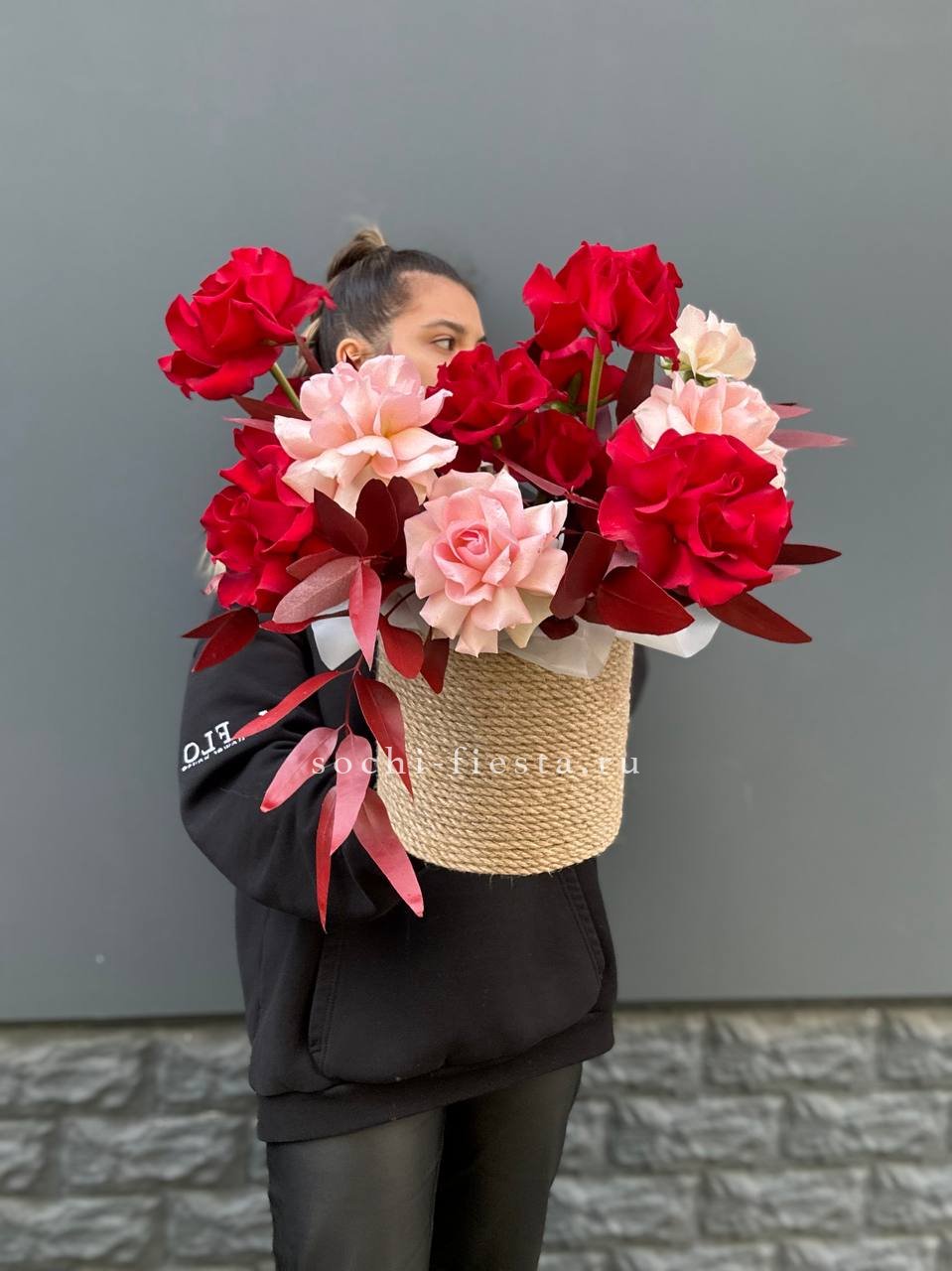 белые и кустовые розы, диантус в джутовом кашпо с эвкалиптом.