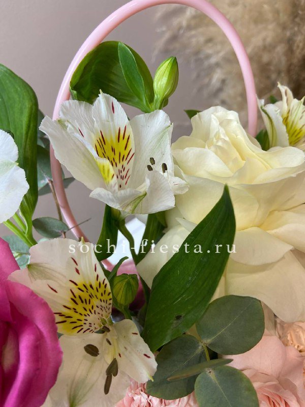 розовая роза, пионовидная роза, диантус, альсромерия, эвкалипт, лента, сумка.