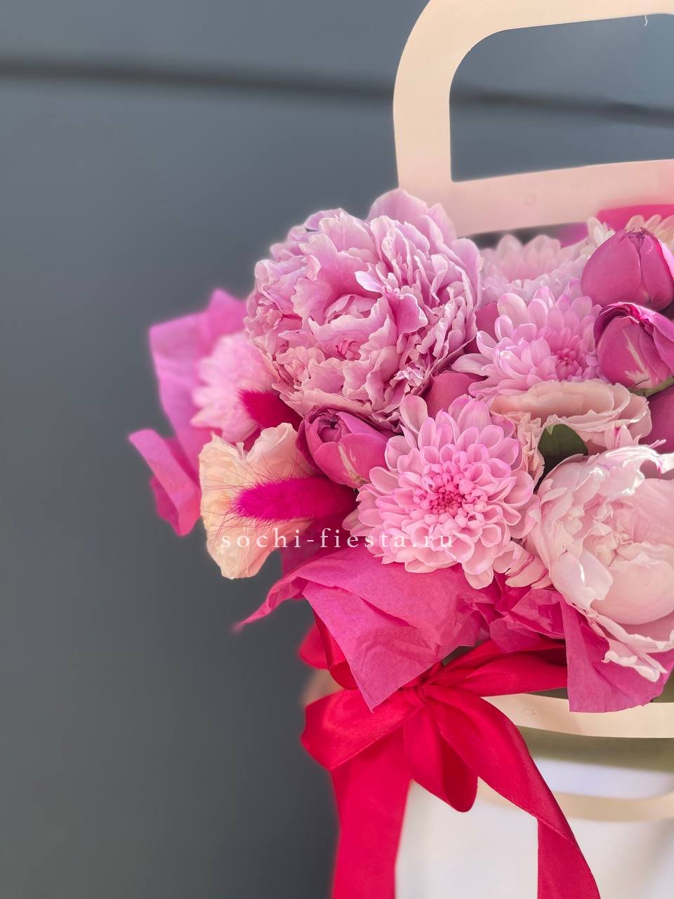 пионы, хризантемы,кустовые розы,лагурус, лента, сумка-кашпо.