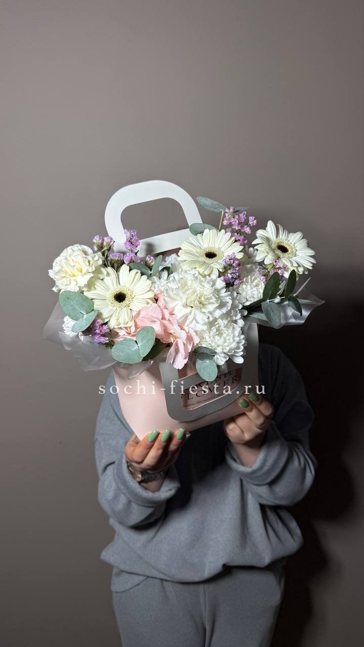 Розовые розы и диантусы переплетаются с кустовыми хризантемами в плотной округлой композиции. Альстромерия добавляет графичные акценты между бутонами. Сумочка собирает все элементы в аккуратную форму с естественным объёмом.