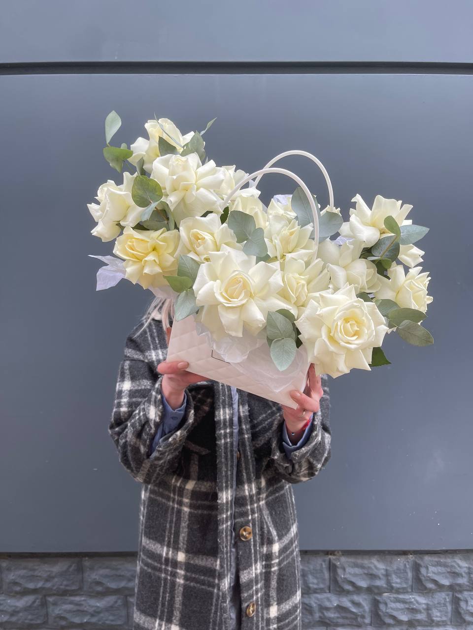 Хризантемы и маттиола собраны в компактную форму с лиловыми переливами. Статица добавляет воздушности, а сумочка делает композицию мобильной и готовой к вручению. Цветы закреплены в оазисе для длительной свежести.