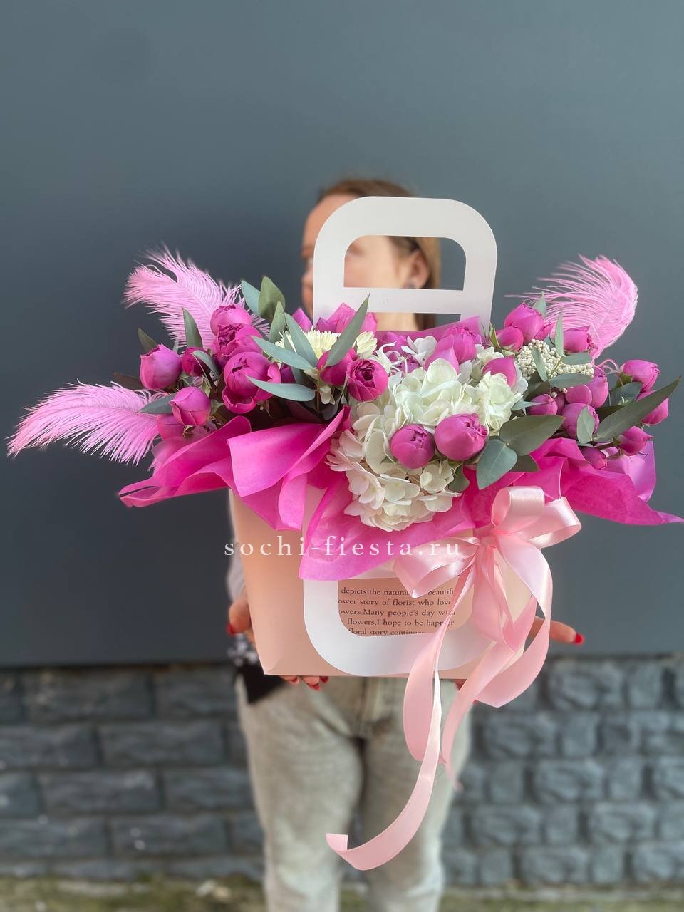 сумочка с гортензией, мисти баблс, герберой, озатамусом и эвкалиптом.