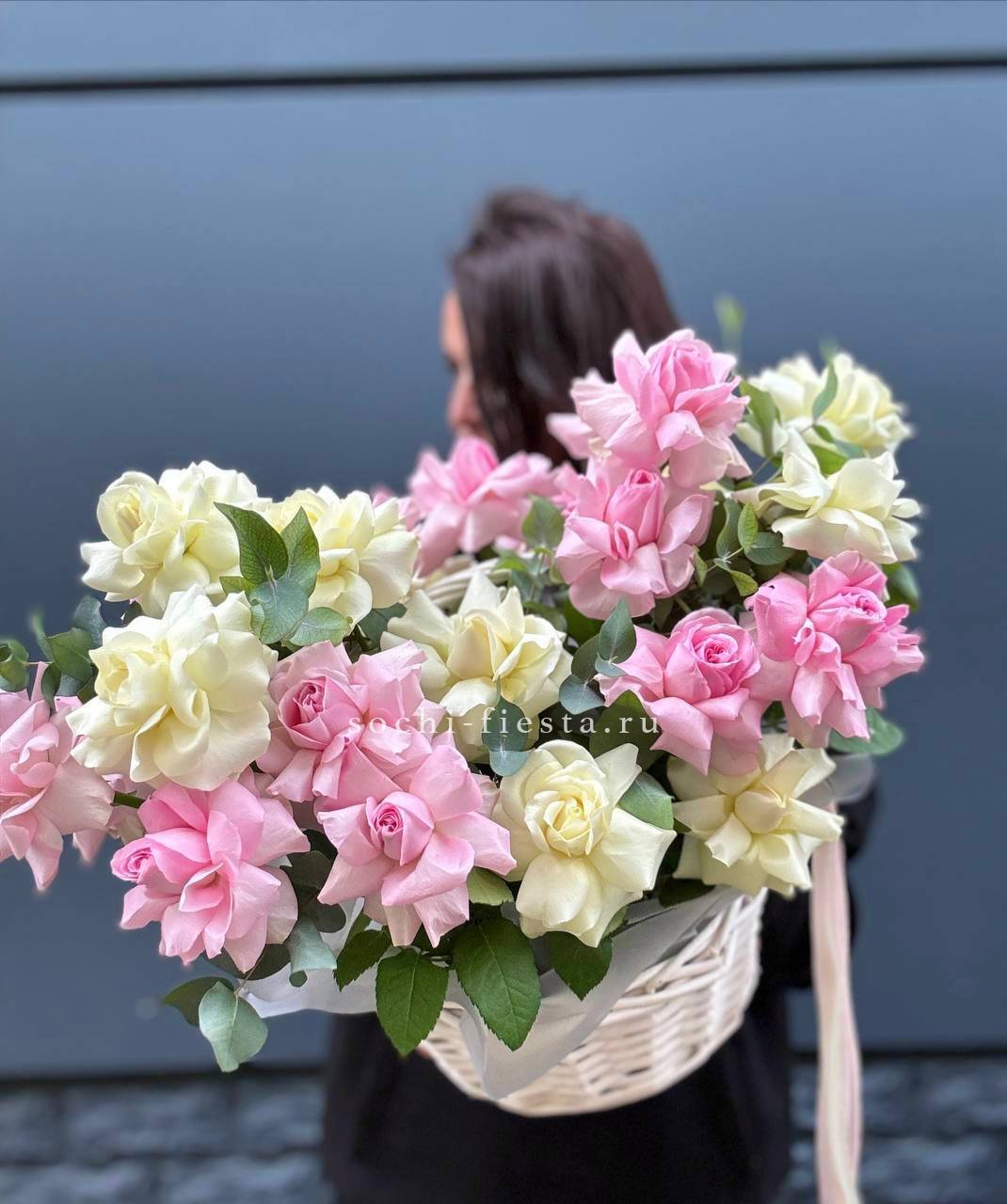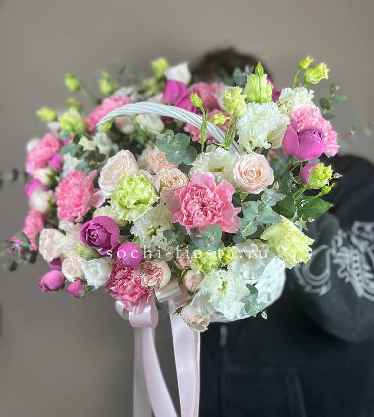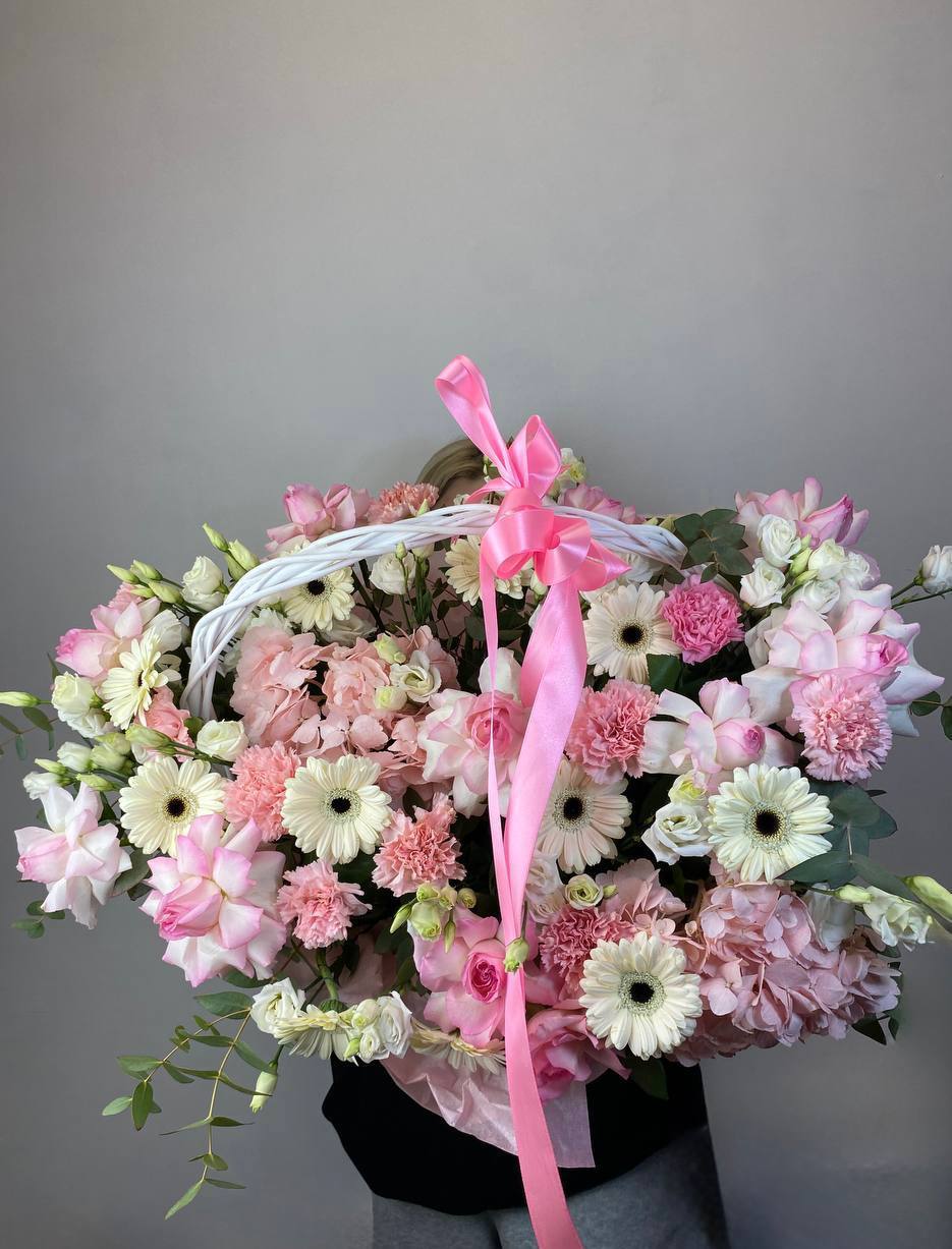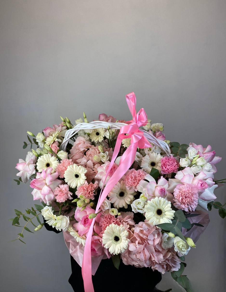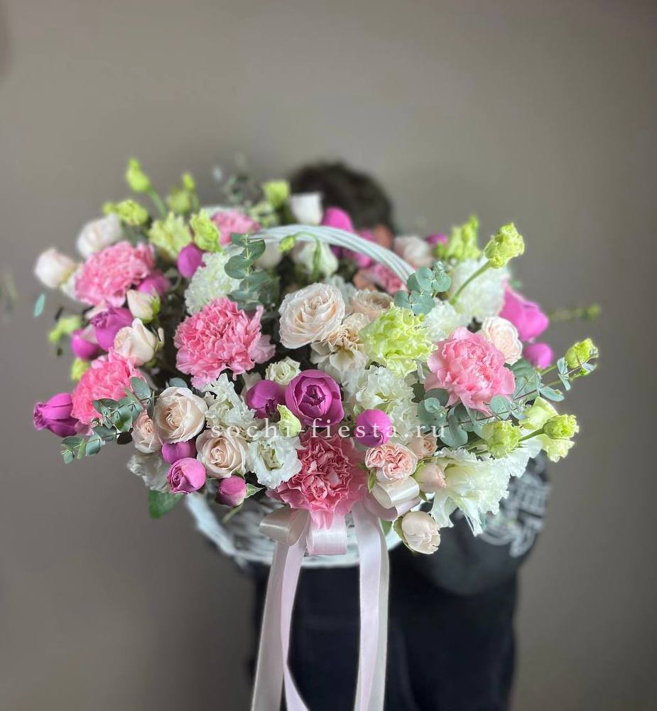 корзина выполнена в нежно-сиреневых тонах с применением декоративной зелени Состав: диантусы, эустома, эвкалипт, декоративная зелень,розы лента, светлая корзина.