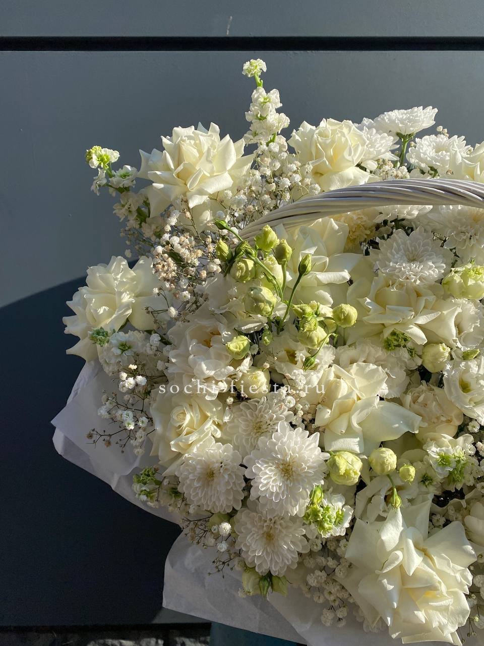 Пышная корзина с розами и гортензиями собрана плотно и объёмно. Маттиола добавляет живую текстуру между крупными соцветиями, а кустовые розы заполняют композицию мягкими переходами. Результат — впечатляющее присутствие, которое меняет восприятие пространства.