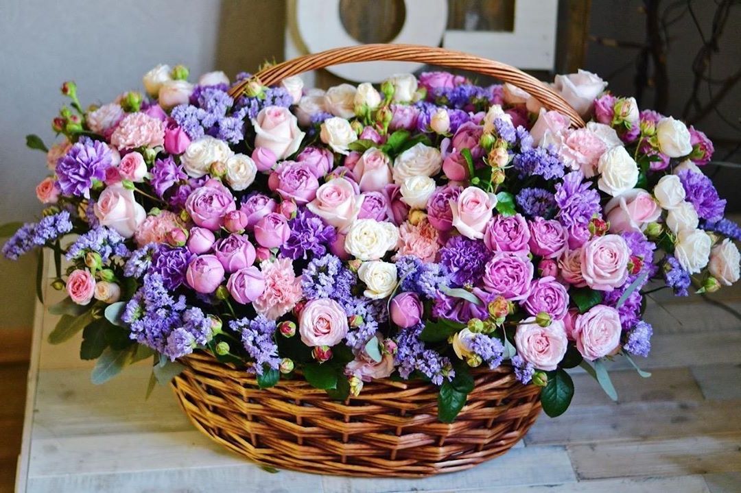 маттиола, гортензии, кустовые розы, розовые розы в корзине.