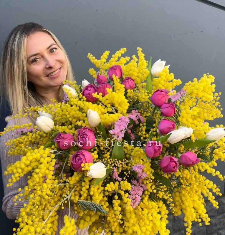 Солнечная мимоза встречается с тюльпанами и пионовидными розами Мисти Бабблс. Весенняя палитра собрана в корзине, где каждый цветок занимает свое место в общем ритме.