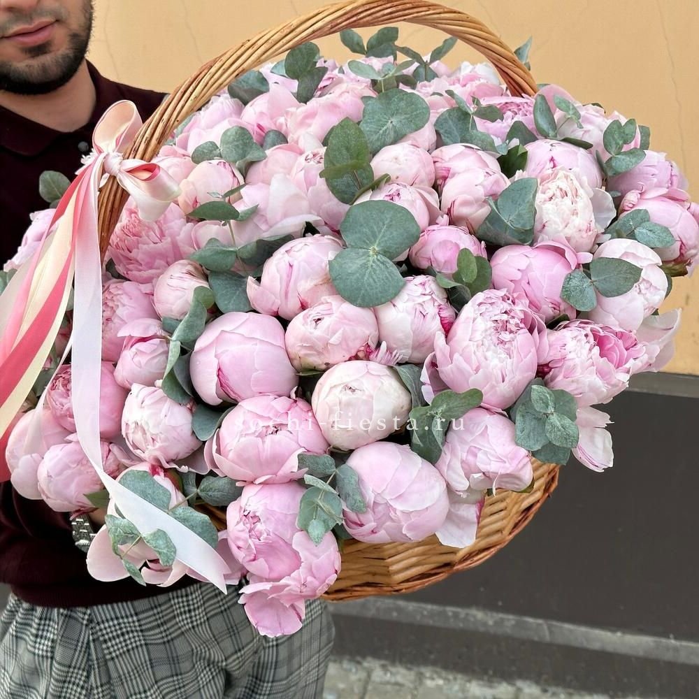 Семьдесят пять пионов сорта Сара Бернар создают пышное облако коралловых оттенков. Корзина наполнена крупными бутонами с лёгким обрамлением эвкалипта и занимает центральное место в любом интерьере.