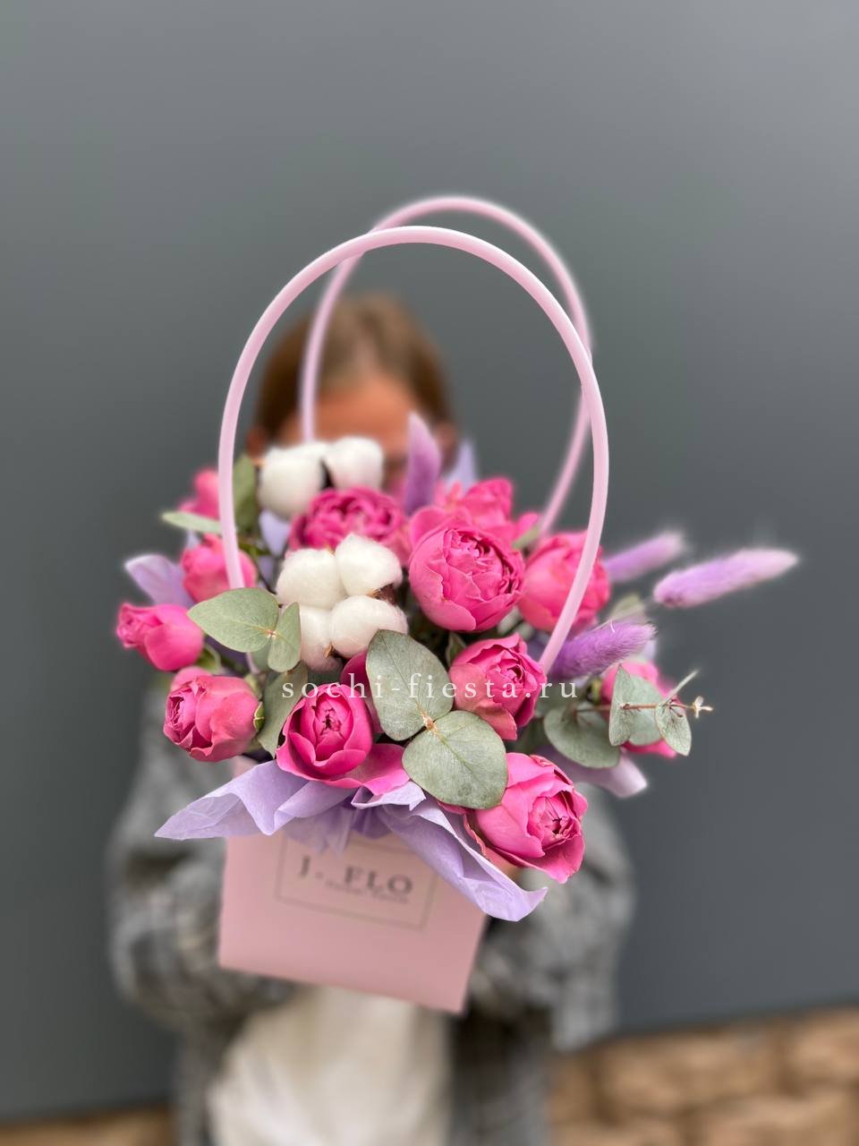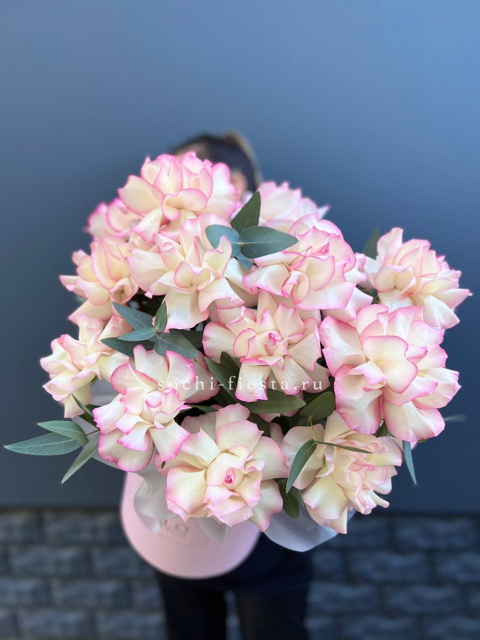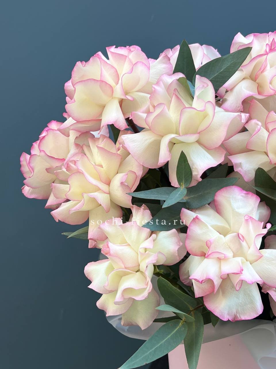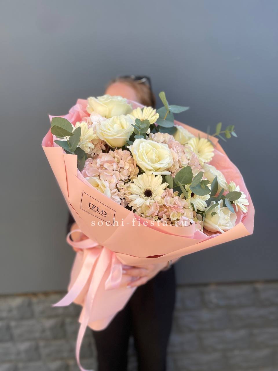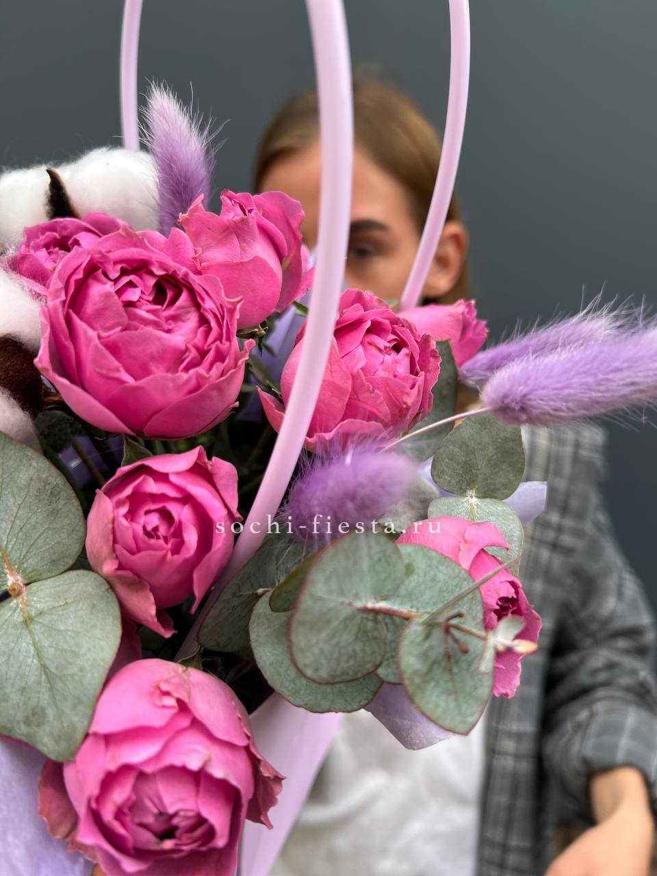 розы, диантусы, пионовидные кустовые розы, гортензия, эвкалипт, вспомогательная зелень, лента, дизайнерская упаковка.