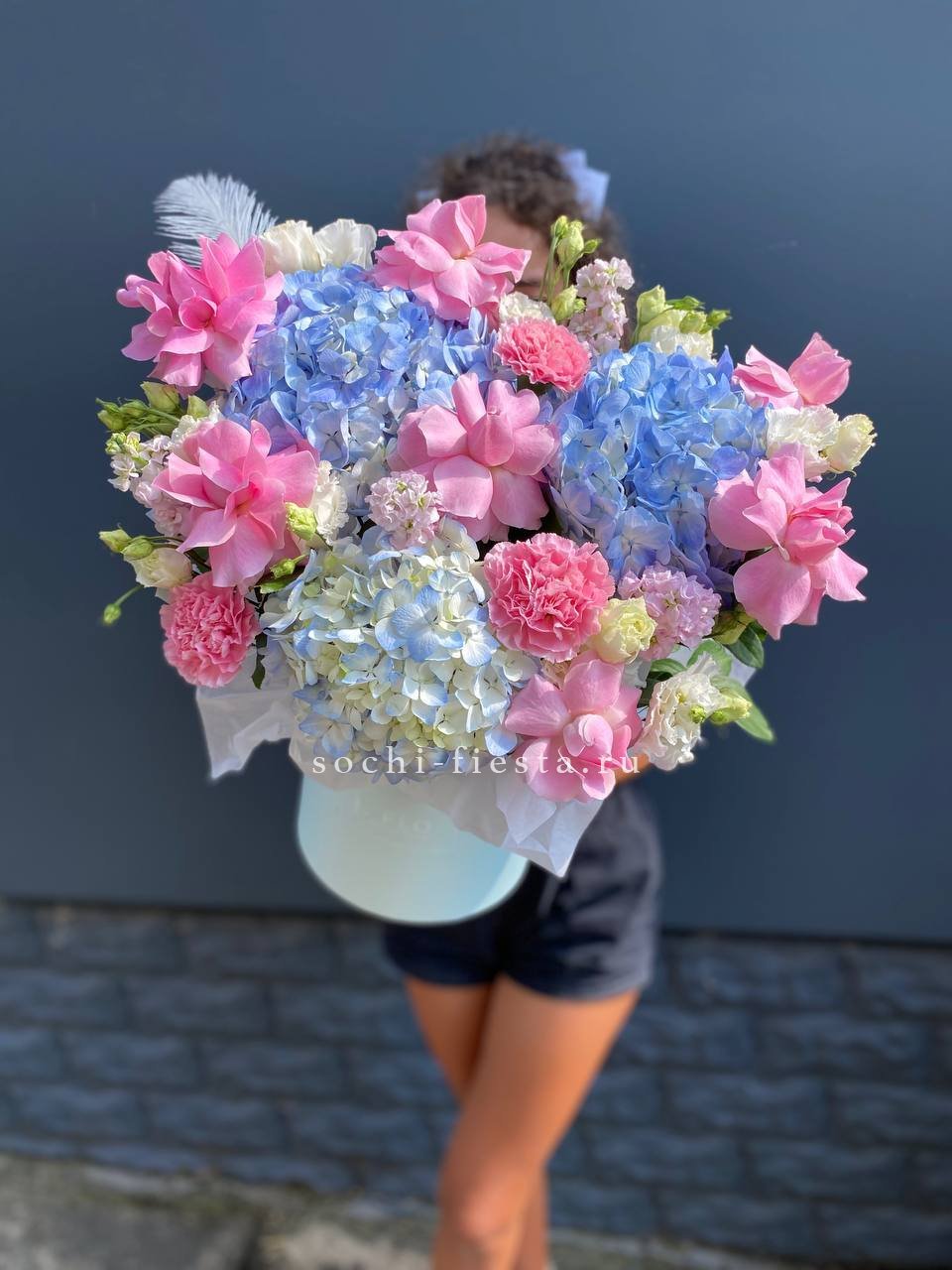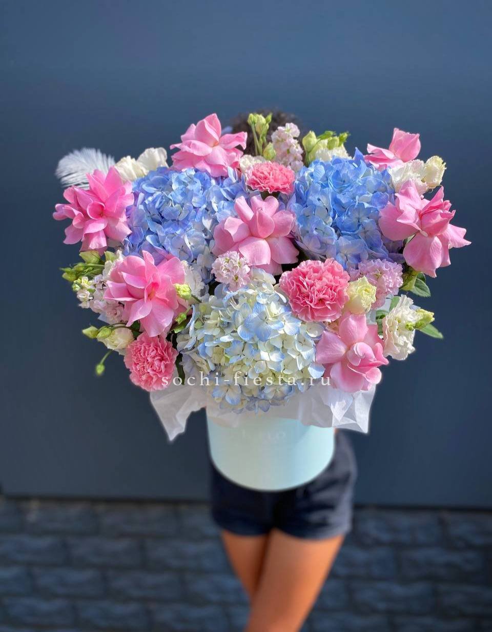 Сине-фиолетовая гамма с переходом в лавандовые и пыльно-розовые оттенки создает глубокую многослойную палитру. Пионовидные формы и воздушная гортензия дают объемную текстуру, а эвкалипт добавляет графичности.