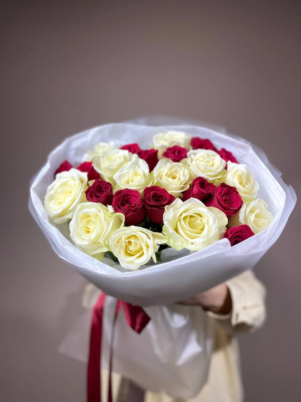 Красный и белый образуют чёткий графический рисунок в каждом повороте букета. 25 роз собраны плотно, создавая объёмную композицию с выразительной игрой оттенков.