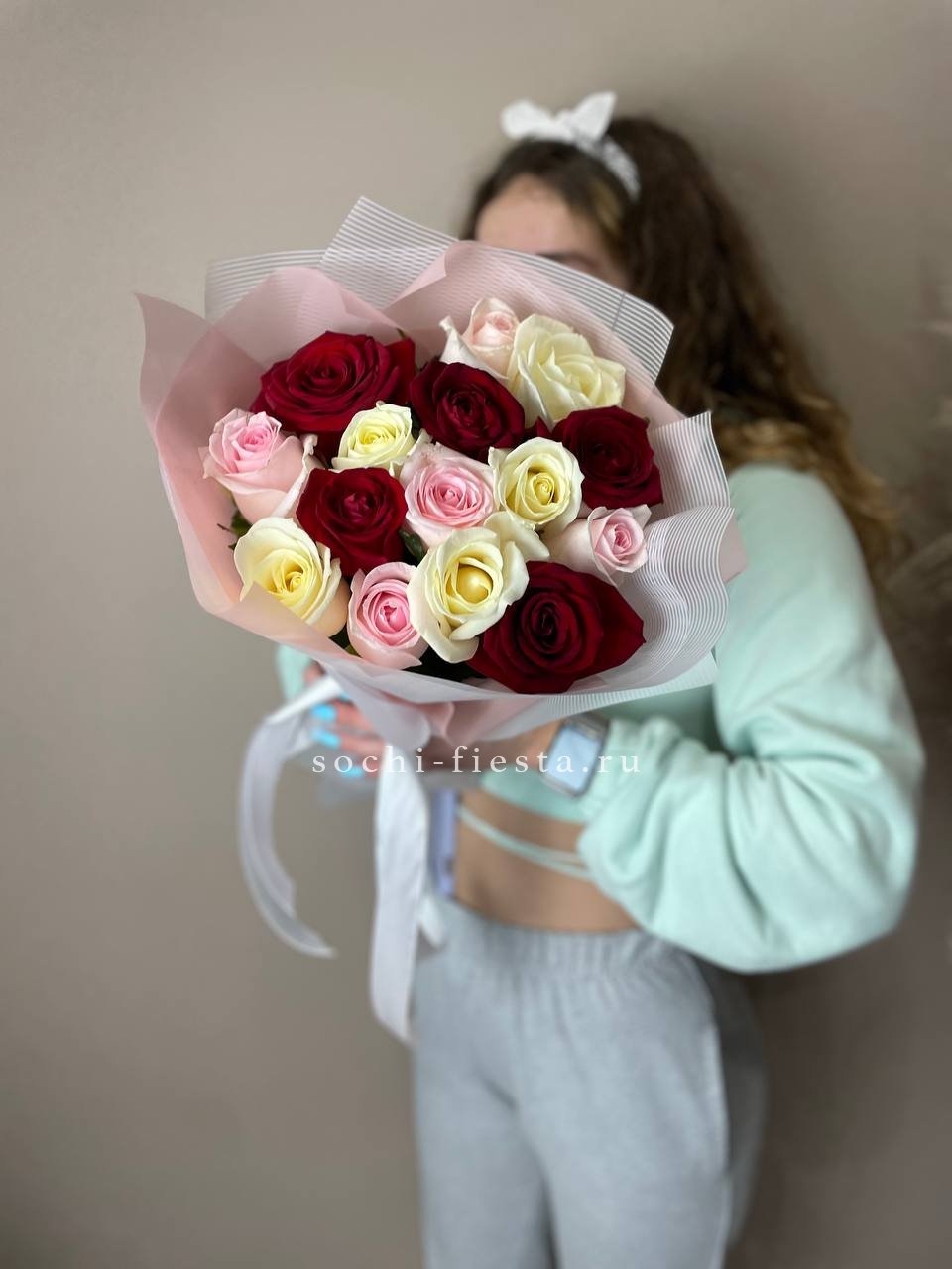 Пятнадцать роз в красно-белом исполнении собраны аккуратно и компактно. Такая композиция удобна для размещения на столе и не требует высоких ваз.